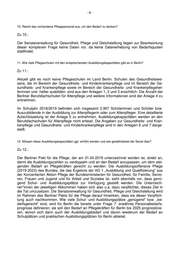 -8- 10. Reicht das vorhandene Pflegepersonal aus, um den Bedarf zu decken? Zu 10.: Der Senatsverwaltung für Gesundheit, Pflege und Gleichstellung liegen zur Beantwortung dieser komplexen Frage keine Daten vor, da keine Datenerhebung von Bedarfsquoten stattfindet. 11. Wie viele Pflegeschulen mit den entsprechenden Ausbildungskapazitäten gibt es in Berlin? Zu 11.: Aktuell gibt es noch keine Pflegeschulen im Land Berlin. Schulen des Gesundheitswe- sens, die im Bereich der Gesundheits- und Kinderkrankenpflege und im Bereich der Ge- sundheits- und Krankenpflege sowie im Bereich der Gesundheits- und Krankenpflegehel- ferinnen und -helfer ausbilden, sind aus den Anlagen 1, 2 und 3 ersichtlich. Die Anzahl der Berliner Berufsfachschulen für Altenpflege und weitere Informationen sind der Anlage 4 zu entnehmen. Im Schuljahr 2018/2019 befinden sich insgesamt 2.907 Schülerinnen und Schüler bzw. Auszubildende in der Ausbildung zur Altenpflegerin oder zum Altenpfleger. Eine detaillierte Aufschlüsselung ist der Anlage 5 zu entnehmen. Ausbildungskapazitäten werden an den Berufsfachschulen für Altenpflege nicht erfasst. Die Angaben zur Gesundheits- und Kran- kenpflege und Gesundheits- und Kinderkrankenpflege sind in den Anlagen 6 und 7 darge- stellt. 12. Müssen diese Ausbildungskapazitäten ggf. erhöht werden und wie gewährleistet der Senat dies? Zu 12.: Der Berliner Pakt für die Pflege, der am 01.04.2019 unterzeichnet worden ist, strebt an, damit die Ausbildungszahlen zu verdoppeln und an den Bedarf anzupassen, um dem stei- genden Bedarf an Pflegekräften gerecht zu werden. Die Ausbildungsoffensive Pflege (2019-2023) des Bundes, die das Ergebnis der AG 1 „Ausbildung und Qualifizierung“ aus der Konzertierten Aktion Pflege der Bundesministerien für Gesundheit, für Familie, Senio- ren, Frauen und Jugend und für Arbeit und Soziales ist, sieht ebenfalls vor, dass genü- gend Schul- und Ausbildungsplätze zur Verfügung gestellt werden. Die Unterzeich- ner*innen der jeweiligen Abkommen haben sich also u.a. dazu verpflichtet, dieses Ziel in die Tat umzusetzen. Die Senatsverwaltung für Gesundheit, Pflege und Gleichstellung wird im Rahmen des Berliner Pakts für die Pflege darauf hinwirken, dass sie dieser Verpflich- tung auch nachkommen. Wie viele Schul- und Ausbildungsplätze „genügend“ bzw. „be- darfsgerecht“ sind, wird für Berlin die bereits unter Frage 7. erwähnte Personalbedarfs- prognose definieren; sie soll den Bedarf an Pflegekräften für Berlin bis 2025 prognostizie- ren, wovon sich dann auch der Ausbildungsbedarf und davon wiederum der Bedarf an Schulplätzen und praktischen Ausbildungsplätzen für Berlin ableitet.