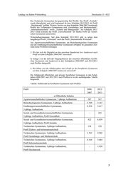 Landtag von Baden-Württemberg Drucksache 15 / 4525 Das Technische Gymnasium hat gegenwärtig fünf Profile: Das Profil „Technik“ wurde überarbeitet und wird beginnend ab dem Schuljahr 2012/2013 als Profil „Mechatronik“ geführt. Weitere, bereits vor dem Schuljahr 2006/2007 bestehende Profile des Technischen Gymnasiums sind „Gestaltungs- und Medientechnik“, „Informationstechnik“ sowie „Technik und Management“. Im Schuljahr 2011/ 2012 wurde erstmals das Profil „Umwelttechnik“ als fünftes Profil am Techni- schen Gymnasium unterrichtet. Wirtschaftsgymnasium: Seit dem Schuljahr 2011/2012 gibt es neben dem langjährigen Profil „Wirtschaft“ auch das Profil „Internationale Wirtschaft“. Am Agrarwissenschaftlichen Gymnasium, am Biotechnologischen Gymnasium und am Ernährungswissenschaftlichen Gymnasium erfolgten im genannten Zeit- raum keine Profilentwicklungen. 3. Wie hat sich die Zügigkeit an den einzelnen Standorten bzw. landesweit nach Profil seit dem Schuljahr 2006/2007 entwickelt? In Anlage 2 ist die Zahl der Eingangsklassen der einzelnen öffentlichen berufli- chen Gymnasien und landesweit in den Schuljahren 2006/2007 und 2012/2013 nach Profilen dargestellt. 4. Wie haben sich die Schülerzahlen nach Profil an den beruflichen Gymnasien seit dem Schuljahr 2006/2007 landesweit entwickelt? Die Schülerzahl öffentlicher und privater beruflicher Gymnasien in den Schul- jahren 2006/2007 und 2012/2013 nach Profilen ist in der nachfolgenden Tabelle dargestellt. Tabelle: Schülerzahl an beruflichen Gymnasien nach Profilen Profil 2006/ 2012/ 2007 2013 a) Öffentliche Schulen Agrarwissenschaftliches Gymnasium, 3-jährige Aufbauform 587 547 Biotechnologisches Gymnasium, 3-jährige Aufbauform 2.769 3.167 Ernährungswissenschaftliches Gymnasium, 4.524 3.617 3-jährige Aufbauform Sozial- und Gesundheitswissenschaftliches Gymnasium, – 245 3-jährige Aufbauform, Profil Gesundheit Sozial- und Gesundheitswissenschaftliches Gymnasium, 422 6.839 3-jährige Aufbauform, Profil Soziales Technisches Gymnasium, 3-jährige Aufbauform, 138 120 Profil Elektro- und Informationstechnik Technisches Gymnasium, 3-jährige Aufbauform, 1.763 2.902 Profil Gestaltungs- und Medientechnik Technisches Gymnasium, 3-jährige Aufbauform, 4.164 3.664 Profil Informationstechnik Technisches Gymnasium, 3-jährige Aufbauform, – 1.920 Profil Mechatronik 3