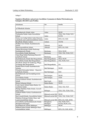 Landtag von Baden-Württemberg Drucksache 15 / 4525 Technisches Gymnasium, 3-jährige Aufbauform, 135 152 Profil Angewandte Naturwissenschaften Technisches Gymnasium, 3-jährige Aufbauform, 6.515 3.501 Profil Technik (auslaufend ab 2012/13) Technisches Gymnasium, 3-jährige Aufbauform, 527 3.008 Profil Technik und Management Technisches Gymnasium, 3-jährige Aufbauform, – 760 Profil Umwelttechnik Wirtschaftswissenschaftliches Gymnasium, – 1.049 3-jährige Aufbauform, Profil Internationale Wirtschaft Wirtschaftswissenschaftliches Gymnasium, 21.734 21.748 3-jährige Aufbauform, Profil Wirtschaft Ernährungs- bzw. Sozial- und Gesundheitswissenschaftliches – 99 Gymnasium, 6-jährige Aufbauform Technisches Gymnasium, 6-jährige Aufbauform – 332 Wirtschaftswissenschaftliches Gymnasium, 1.015 1.489 6-jährige Aufbauform b) Private Schulen Ernährungswissenschaftliches Gymnasium, 72 63 3-jährige Aufbauform Sozial- und Gesundheitswissenschaftliches Gymnasium, – 20 3-jährige Aufbauform, Profil Gesundheit Sozial- und Gesundheitswissenschaftliches Gymnasium, 718 2.774 3-jährige Aufbauform, Profil Soziales Technisches Gymnasium, 3-jährige Aufbauform, 50 405 Profil Gestaltungs- und Medientechnik Technisches Gymnasium, 3-jährige Aufbauform, – 9 Profil Angewandte Naturwissenschaften Technisches Gymnasium, 3-jährige Aufbauform, 42 – Profil Informationstechnik Wirtschaftswissenschaftliches Gymnasium, 662 1.022 3-jährige Aufbauform, Profil Wirtschaft Wirtschaftswissenschaftliches Gymnasium, – 83 6-jährige Aufbauform Quelle: Statistisches Landesamt Baden-Württemberg. 4