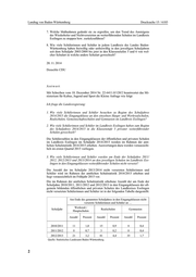 Landtag von Baden-Württemberg Drucksache 15 / 6185 7. Welche Maßnahmen gedenkt sie zu ergreifen, um den Trend des Ansteigens der Wiederholer und Nichtversetzten an weiterführenden Schulen im Landkreis Esslingen zu stoppen bzw. zurückzuführen? 8. Wie viele Schülerinnen und Schüler in jedem Landkreis des Landes Baden- Württemberg haben freiwillig oder unfreiwillig in den jeweiligen Schuljahren seit dem Schuljahr 2003/2004 bis jetzt in den Klassenstufen 5 und 6 von wel- cher Schulart in welche andere Schulart gewechselt? 20. 11. 2014 Deuschle CDU Antwort Mit Schreiben vom 18. Dezember 2014 Nr. 22-6411.0/120/2 beantwortet das Mi- nisterium für Kultus, Jugend und Sport die Kleine Anfrage wie folgt: Ich frage die Landesregierung: 1. Wie viele Schülerinnen und Schüler besuchen zu Beginn des Schuljahres 2014/2015 die Eingangsklasse an den einzelnen Haupt- und Werkrealschulen, Realschulen, Gemeinschaftsschulen und Gymnasien im Landkreis Esslingen? 2. Wie viele Schülerinnen und Schüler im Landkreis Esslingen haben zum Beginn des Schuljahres 2014/2015 in die Klassenstufe 5 privater weiterführender Schulen gewechselt? Die Schülerzahlen in den Eingangsklassen der öffentlichen und privaten Schulen im Landkreis Esslingen im Schuljahr 2014/2015 werden im Rahmen der amt- lichen Schulstatistik 2014/2015 erhoben. Auswertungen dazu werden voraussicht- lich im ersten Quartal 2015 vorliegen. 3. Wie viele Schülerinnen und Schüler wurden am Ende der Schuljahre 2011/ 2012, 2012/2013 und 2013/2014 an den jeweiligen Schulen im Landkreis Ess- lingen in den Eingangsklassen weiterführender Schulen nicht versetzt? Die Anzahl der im Schuljahr 2013/2014 nicht versetzten Schülerinnen und Schüler wird im Rahmen der amtlichen Schulstatistik 2014/2015 erhoben und liegt voraussichtlich im Frühjahr 2015 vor. Die im Rahmen der amtlichen Schulstatistik erhobene Anzahl der am Ende der Schuljahre 2010/2011, 2011/2012 und 2012/2013 in den Eingangsklassen der all- gemein bildenden öffentlichen und privaten Schulen des Landkreises Esslingen nicht versetzten Schülerinnen und Schüler ist in der folgenden Tabelle dargestellt: Am Ende des genannten Schuljahres in den Eingangsklassen nicht versetzte Schülerinnen und Schüler an … Werkreal-/ Schuljahr Realschulen Gymnasien Hauptschulen Anzahl Prozent Anzahl Prozent Anzahl Prozent 2010/2011 11 1,0 15 0,9 8 0,4 2011/2012 8 0,7 3 0,2 8 0,4 2012/2013 21 3,2 81 4,4 35 1,7 Quelle: Statistisches Landesamt Baden-Württemberg. 2