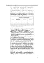 Landtag von Baden-Württemberg Drucksache 15 / 6185 4. Wie viele Schülerinnen und Schüler wiederholten in den Schuljahren 2011/ 2012, 2012/2013 und 2013/2014 die Eingangsklassen an den jeweiligen weiter- führenden Schulen im Landkreis Esslingen? Die Anzahl der Klassenwiederholer im Schuljahr 2013/2014 wird im Rahmen der amtlichen Schulstatistik 2014/2015 erhoben und liegt voraussichtlich im Frühjahr 2015 vor. Die im Rahmen der amtlichen Schulstatistik erhobene Anzahl der Klassenwieder- holer in den Eingangsklassen der allgemein bildenden öffentlichen und privaten Schulen des Landkreises Esslingen in den Schuljahren 2011/2012, 2012/2013 und 2013/2014 ist in der folgenden Tabelle dargestellt: Wiederholer in den Eingangsklassen der … Werkreal-/ Schuljahr Realschulen Gymnasien Hauptschulen Anzahl Prozent Anzahl Prozent Anzahl Prozent 2011/2012 8 0,7 16 0,9 8 0,4 2012/2013 11 1,7 6 0,3 7 0,3 2013/2014 7 1,4 38 2,1 8 0,4 Quelle: Statistisches Landesamt Baden-Württemberg. 5. Welche Gründe sieht sie für die Tatsache, dass die Zahl der wiederholenden Schülerinnen und Schüler in den Eingangsklassen weiterführender Schulen, insbesondere der Realschulen im Landkreis Esslingen, sich im Vergleich der Schuljahre 2012/2013 und 2013/2014 mehr als versechsfacht hat? 6. Welche Ursachen hat sie erkannt, die die Tatsache begründen, dass sich im Landkreis Esslingen die Zahl der nicht versetzten Schülerinnen und Schüler in den Eingangsklassen am Ende des Schuljahres 2012/2013 im Vergleich zum Ende des Schuljahres 2011/2012 an den Werkreal- und Hauptschulen fast ver- dreifacht hat, an den Realschulen um das 27-Fache und an den Gymnasien um das 4,3-Fache erhöht hat? Die Schülerschaft des Landkreises Esslingen veränderte sich in der Zusammen- setzung über die Jahre hinweg nicht signifikant. Die erste Gemeinschaftsschule wurde im Landkreis Esslingen im Schuljahr 2013/ 2014 eingeführt. Aus diesem Grund wechselten die Schülerinnen und Schüler in diesem Landkreis im Schuljahr 2012/2013 von der Grundschule auf eine Werk- realschule/Hauptschule, eine Realschule oder ein Gymnasium. Die Übergangs- quoten zeigen, dass der Grundschulempfehlung nur bedingt gefolgt wurde. Die landesweit moderat angestiegene Quote der Nichtversetzten an weiterführen- den Schulen ist, vor dem Hintergrund des sich veränderten Schulwahlverhaltens, ein Beleg der hervorragenden Arbeit, die an den Schulen in der Orientierungs- stufe geleistet wird. Darüber hinaus wird deutlich, dass der Wegfall der verbind- lichen Grundschulempfehlung ein Auslöser aber nicht die alleinige Ursache für eine Erhöhung der Nichtversetztenquote an den weiterführenden Schulen ist. Für die allgemein bildenden Gymnasien im Landkreis Esslingen sind keine signi- fikanten Veränderungen in der Zahl wiederholender Schülerinnen und Schüler in den Eingangsklassen im Vergleich der Schuljahre 2012/2013 und 2013/2014 fest- stellbar. An den Gymnasien des Landkreises Esslingen setzt sich für das Schuljahr 2012/ 2013 die seit Jahren stetig steigende Übergangsquote ans Gymnasium fort. Lan- desweit verstärkt sich hier nach Wegfall der verbindlichen Grundschulempfeh- lung auch die Heterogenität der Kinder in Klasse 5. Dies stellt die Schulen vor besondere pädagogische Herausforderungen, die diese erfolgreich meistern. Am 3