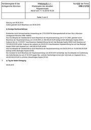 Handelsregister B des Amtsgerichts München Abteilung B - Vertraulich - Wiedergabe des aktuellen Registerinhalts Abruf vom 11.10.2018 16:24 Nummer 25 der Firma: HRB 212700 Seite 2 von 2 Satzung vom 08.05.2014 Zuletzt geändert durch Beschluss vom 08.05.2018 b) Sonstige Rechtsverhältnisse: Entstanden durch formwechselnde Umwandlung der CTS EVENTIM Aktiengesellschaft mit dem Sitz in München (Amtsgericht München HRB 156963). Das Grundkapital der Gesellschaft ist durch Beschluss der Hauptversammlung vom 21.01.2000, geändert durch Beschluss der Hauptversammlung vom 23.08.2005 um 360.000,00 EUR bedingt erhöht (Bedingtes Kapital 2000/I). Aufgrund der am 13.05.2011 beschlossenen Kapitalerhöhung hat sich das Bedingte Kapital 2000/I kraft Gesetzes auf 720.000,00 EUR erhöht. Aufgrund der weiteren am 08.05.2014 beschlossenen Kapitalerhöhung hat sich das Bedingte Kapital 2000/I kraft Gesetzes auf 1.440.000,00 EUR erhöht. Das Grundkapital der Gesellschaft ist durch Beschluss der Hauptversammlung vom 08.05.2018 um 19.200.000,00 EUR bedingt erhöht (Bedingtes Kapital 2018/I). . Der Vorstand ist durch Beschluss der Hauptversammlung vom 08.05.2014 ermächtigt, das Grundkapital mit Zustimmung des Aufsichtsrates bis zum 07.05.2019 gegen Bar- und/oder Sacheinlage einmal oder mehrmals um insgesamt bis zu 48.000.000,00 EUR zu erhöhen (Genehmigtes Kapital 2014/I). 7. a) Tag der letzten Eintragung: 08.06.2018