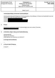Handelsregister B des Amtsgerichts Hamburg Abteilung B - Vertraulich - Wiedergabe des aktuellen Registerinhalts Abruf vom 15.10.2018 12:06 Nummer 27 der Firma: HRB 129556 Seite 2 von 2 Vertretungsberechtigte und besondere Vertretungsbefugnis: Vertretungsberechtigt gemäß allgemeiner Vertretungsregelung; mit der Befugnis, im Namen der Gesellschaft mit sich als Vertreter eines Dritten Rechtsgeschäfte abzuschließen: Vorstand: Vorstand: Vorstand: 5. Prokura: Gesamtprokura gemeinsam mit einem Vorstandsmitglied oder einem anderen Prokuristen: 6. a) Rechtsform, Beginn, Satzung oder Gesellschaftsvertrag: Aktiengesellschaft Satzung vom 19.09.2013 Zuletzt geändert durch Beschluss vom 09.05.2017 b) Sonstige Rechtsverhältnisse: --- 7. a) Tag der letzten Eintragung: 21.06.2017
