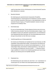 Information zur netztechnischen Anbindung an das Kraftfahrt-Bundesamt für Behörden 7 zugriff auf lokale Netze“ (ISi-Fern, BSI-Standards zur Internet-Sicherheit ) beschrie- benen Maßnahmen zu beachten. 5. Räumliche Sicherheit Die Unterbringung der systemtechnischen Komponenten (PrivateWire- Verschlüsselungsserver, Anwendungsserver/TLS-Gateways) ist räumlich, organisa- torisch und technisch abzusichern (Serverraum), so dass gewährleistet ist, dass nur autorisierte Personen Zugang zur "PrivateWire-Kopfstelle" und/oder den Anwen- dungsservern/TLS-Gateways haben. 6. Sicherheitskonzept Es muss ein Sicherheitskonzept / Practise Statement (formlos) oder die für die be- troffene Anwendung relevanten Teile eines Sicherheitskonzeptes vorliegen, in dem die detaillierte Umsetzung der geforderten organisatorischen und sicherheitstechni- schen Mindestanforderungen beschrieben wird. Das Sicherheitskonzept ist bei Än- derungen fortzuschreiben und dem KBA erneut vorzulegen. 7. Verpflichtungserklärung und Zulassungsbescheid Die Aufnahme des Wirkbetriebes der Kopfstelle darf erst nach Erhalt des vom KBA ausgestellten Zulassungsbescheids erfolgen. Voraussetzung für die Erteilung des Zulassungsbescheids ist eine vom externen Kommunikationspartner (d. h. der ab- rufberechtigten Stelle) unterschriebene Verpflichtungserklärung, in der dieser sich zur Umsetzung und Einhaltung der unter den Punkten 1. – 7. genannten Anforde- rungen verpflichtet. Ein Vordruck für die Verpflichtungserklärung wird nach Antrag- stellung für die Anbindung über eine Kopfstelle übersandt. 8. Zugangssperrung Die Nichteinhaltung einer oder mehrerer der unter Punkt 1. bis 7. beschriebenen Vo- raussetzungen kann zum Widerruf des Zulassungsbescheides bei gleichzeitiger 7 https://www.bsi.bund.de/DE/Themen/StandardsKriterien/ISi-Reihe/ISi-Fern/isi-fern.html Stand: November 2017 Seite 9/13 Anhangseite 34 von 531