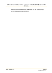 Information zur netztechnischen Anbindung an das Kraftfahrt-Bundesamt für Behörden Sperrung der Zugangsberechtigung der Kopfstelle bzw. der Anwendungsser- ver/TLS-Gateways durch das KBA führen. Stand: November 2017 Seite 10/13 Anhangseite 35 von 531