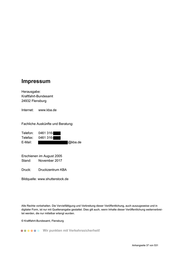 Impressum Herausgabe: Kraftfahrt-Bundesamt 24932 Flensburg Internet: www.kba.de Fachliche Auskünfte und Beratung: Telefon: Telefax: E-Mail: 0461 316- 0461 316- @kba.de Erschienen im August 2005 Stand: November 2017 Druck: Druckzentrum KBA Bildquelle: www.shutterstock.de Alle Rechte vorbehalten. Die Vervielfältigung und Verbreitung dieser Veröffentlichung, auch auszugsweise und in digitaler Form, ist nur mit Quellenangabe gestattet. Dies gilt auch, wenn Inhalte dieser Veröffentlichung weiterverbrei- tet werden, die nur mittelbar erlangt wurden. © Kraftfahrt-Bundesamt, Flensburg Wir punkten mit Verkehrssicherheit! Anhangseite 37 von 531