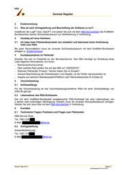 Information zur netztechnischen Anbindung an das Kraftfahrt-Bundesamt für Behörden Ansprechpartner beim Kraftfahrt-Bundesamt Technische Informationen bezüglich der Netzanbindung und der Sicherheitsmaßnahmen erhalten Sie über: Technischer Support Tel.: (0461) 316- Fax: (0461) 316- E-Mail: @kba.de Informationen zur Beantragung sowie Antragsunterlagen erhalten Sie über: Anwenderbetreuung Tel.: (0461) 316- Fax.: (0461) 316- E-Mail: @kba.de Kraftfahrt-Bundesamt 24932 Flensburg Internet: www.kba.de Stand: November 2017 Seite 11/13 Anhangseite 36 von 531