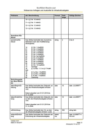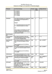 Kra ftfahrt-Bundes a mt Webservice Anfragen und Auskünfte für Infrastrukturabgabe Format Feld- länge Gültige Zeichen Ergänzungstext zur Konkretisierung des Anfrageanlasses string 20 string latin Das Attribut beinhaltet das Unterschei- dungszeichen für den Zulassungsstaat string 3 A-Z Das Attribut beinhaltet das zugeteilte bzw. ausgegebene Kennzeichen. string 9 Abis Z, Ä, Ö, Ü, 0 bis 9, SP kennzeichenAus- land Das Attribut beinhaltet das ausländische Kennzeichen. Angabe kompakt ohne Leer- und Interpunktionszeichen. string 20 A-Z, 0-9 identifikationiSA- Rabschnitt Eindeutige ISAR- Identifikationsnummer Diese Identifikation wird in der externen Mitteilungsverarbeitung des Setreibers benötigt sowie für die interne Sachbear- beitung . string 20 0-9, A-Z Feldname det. Beschreibung 2 = Datenprüfung Entrichtungsdaten zum Zahlungsverfahren 3 = Datenprüfung Mah- nungN ollstreckung 0 = sonstiger Anlass ..... ergaenzungstext Kennzeichen- daten nationalitaeten- kennzeichen Es wird noch vom KBA festgelegt, ob dieses Attribut anhand dem 'Verzeichnis der Staatennamen für den amtlichen Gebrauch in der Bundesrepublik Deutschland" gefüllt wird oder nach ISO 3166 und hier ALPHA-21SO 3166. Kennzeichenda- tenlnland kennzeichenlnland Kennzeichenda- tenAusland Die Vergabe der Nummer erfolgt bei den Gebietsfremden durch den Betreiber. Eine Vorgabe zum Format ist noch zu entscheiden. (z.B. Erster Buchstabe A) Auskunftsdaten Verwaltungsda- ten Auskunft Setreiber zeitpunktAende- rung Version: 0.91 Stand: 01.06.2017 Das Attribut beinhaltet das Datum und die Uhrzeit an dem die Änderung von der Zulassungsbehörde, dem Setreiber oder KBA-intern vorgenommen wurde. dateti- me date JJJJMMTT+/- HH:mm Seite: 24 Anhangseite 117 von 531