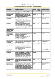 Kra ftfahrt-Bundes a mt Webservice Anfragen und Auskünfte für Infrastrukturabgabe Feldname det. Beschreibung Format Feld- länge Gültige Zeichen string 10 A - Z, 0 bis 9 Kraftfahrt-Bundesamt bereitgestellten, Referenzdatei. Die Datei beinhaltet die amtlichen Bezeichnungen (Klartexte) der Fahrzeugarten bzw. Fahrzeugklas- sen inkl. der Aufbauarten sowie die hier- für vergebenen Schlüssel. Bei der Eingabe von Fahrzeugklassen und deren Aufbauten ist eine Abprüfung der Gültigkeit mit der Referenzdatei vorzunehmen. schluesseiEmissi- onsklasse Das Attribut beinhaltet den nationalen Schlüssel zur Schadstoffklasse bzw. zur Emissionsklasse. Die gültigen Schlüssel ergeben sich aus der vom Kraftfahrt-Bundesamt bereitge- stellten Referenzdatei der Emissions- klassen. Die Datei beinhaltet die amtli- chen Bezeichnungen (Klartexte) der Schadstoffklasse I Emissionsklasse sowie die hierfür vergebenen Schlüssel. Bei der Eingabe der Schadstoffklasse I Emissionsklasse ist eine Abprüfung der Gültigkeit m it der Datei der Emissions- klassen vorzunehmen. Hinw eis zum Attribut "CodeEmissions- klasse" in den TYPDATEN: Bei Fahrzeugen, bei denen eine Emissi- onsverschlüsselung bisher nicht erfolg- te, z. B. bei älteren Fahrzeugen oder bei Fahrzeugen mit Elektromotor (erkennbar an dem Wert "00" an der 5. und 6. Stelle der bisherigen Schlüssei-Nr. zur Fahr- zeug- und Aufbauergänzung) ist in dem Attribut "SLD" in den TYPDATEN der Wert "Space" enthalten . textAufbau Das Attribut beinhaltet Klartextangaben zu Aufbau des Fahrzeugs. string 30 string latin textEmissionsklas- seEGTypgeneh- m igung Das Element beinhaltet die sich auf das Fahrzeug beziehende "EU-Richtlinie" die zur Festlegung der Schadstoffklasse herangezogen wurde string 25 string latin schluesseiKraft- stoff Das Attribut beinhaltet den Schlüssel zur Kraftstoffart bzw. Energiequelle. integer 4 0 bis 9 Die gültigen Schlüssel ergeben sich aus der, vom Kraftfahrt-Bundesamt bereit- gestellten , Referenzdatei. Die Datei beinhaltet die Schlüssel sowie die dazu gehörigen Klartexte. Version: 0.91 Stand: 01.06.2017 Seite: 27 Anhangseite 120 von 531