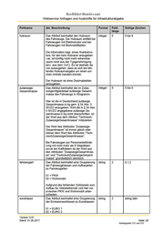 Kraftfahrt-Bundes a mt Webservice Anfragen und Auskünfte für Infrastrukturabgabe Feldname det. Beschreibung Format Feld- länge Gültige Zeichen hubraum Das Attribut beinhaltet den Hubraum des Fahrzeugs. Der Hubraum entfällt bei Fahrzeugen mit Elektromotor und bei Fahrzeugen mit Brennstoffzellen. integer 5 0 bis 9 integer 6 0 bis 9 string 2 0,1,2 string 2 string latin Die Information bzgl. eines Wankelmo- tors, für den kein Hubraum anzugeben w ar, ist künftig nicht mehr erkennbar (auch nicht aus der Typgenehmigung bzw. aus dem CoC). Es ist deshalb da- von auszugehen, dass es sich bei feh- lender Hubraumangabe um einen sol- chen Antrieb handeln könnte. Der Hubraum ist ohne Dezimalstellen einzugeben. zulaessige- Gesamtmasse Das Attribut beinhaltet die im Zulas- sungsmitgliedstaat zulässige Gesamt- masse des Fahrzeugs in Kilogramm. Hier ist die in Deutschland zulässige Gesamtmasse in kg gem . § 34 Abs. 5 StVZO anzugeben . W ird die in § 34 Abs. 5 StVZO angegebene zulässige Ge- samtmasse in kg nicht überschritten, ist der Wert aus dem Attribut "Technisch- ZulaessigeGesamtmasse" mitzuteilen. Der Wert des Attributes "Zulaessige- Gesamtmasse" ist immer gleich oder kleiner dem Wert des Attributes "Tech- nischZulaessigeGesamtmasse". Bei Fahrzeugen zur Personenbeförde- rung mit nicht mehr als 8 Sitzplätzen sowie bei Krafträdern ist der Wert aus den Attributen "ZulaessigeGesamtmas- se" und "TechnischZulaessigeGesamt- masse" grundsätzlich identisch. fahrzeugart Das Attribut beinhaltet eine Gruppierung der Fahrzeugklassen und Aufbauarten zu Fahrzeugarten 01 =PKW 02 = Wohnmobil euroklasse Aufgrund des fehlenden Schlüssels zum Aufbau für Gebietsfremde wird hier nur zwischen PKW und Wohnmobil unter- schieden. Das Attribut beinhaltet eine Gruppierung der Emissionsschlüssel zu Euroklassen 01 =EURO 1 02 =EURO 2 Version: 0.91 Stand: 01 .06.201 7 Seite: 2 8 Anhangseite 121 von 531