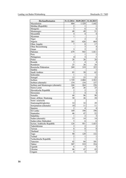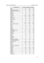 Landtag von Baden-Württemberg Drucksache 15 / 7689 Herkunftsstaaten 31.12.2014 30.09.2015 31.10.2015 Chile 1 2 2 China 502 509 506 Dominikanische Republik 5 4 3 Elfenbeinküste (Cote d‘ Ivoire) 7 10 6 Eritrea 58 169 183 Estland 1 – – Frankreich 4 3 3 Gambia 436 1.321 1.409 Georgien 109 163 192 Ghana 52 58 61 Griechenland 5 5 5 Guinea 10 15 16 Guinea-Bissau 3 4 4 Haiti 1 1 1 Indien 782 839 845 Indonesien 3 1 – Irak 1.241 1.075 1.221 Iran, Islamische Republik 225 272 282 Irland 1 2 2 Israel 4 3 3 Italien 14 14 14 Japan 4 1 1 Jemen 8 7 8 Jordanien 17 15 15 Jugoslawien (ehemals) 327 487 504 Kambodscha 2 2 2 Kamerun 181 262 266 Kanada - 1 1 Kasachstan 32 32 32 Katar 25 2 2 Kenia 16 13 14 Kirgisistan 5 4 4 Kolumbien 2 3 3 Kongo 3 2 2 Kongo, Dem. Republik 18 18 18 Korea, Dem. Volksrepublik 44 51 51 Korea (Republik) 3 3 4 Kosovo 1.064 3.031 3.104 Kroatien 59 57 56 Kuba 4 6 6 Kuwait 31 43 45 Laos, Dem. Volksrepublik 1 1 1 Lettland 1 1 1 Libanon 161 165 153 Liberia 33 31 30 Libyen 25 19 21 Litauen 4 3 3 Malaysia 1 3 3 Mali 2 7 6 Marokko 70 92 95 Mauretanien 2 1 1 15