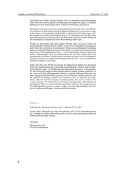 Landtag von Baden-Württemberg Drucksache 16 / 1256 antwortung der Großen Anfrage deutlich wird, wo zukünftige Herausforderungen und bisher noch nicht umgesetzte Handlungsnotwendigkeiten liegen, um digitale Bildung in einem umfassenden Sinne in Baden-Württemberg umzusetzen. Wichtig ist uns hierbei eine aktive und gestaltende Haltung, die die in der öffentli- chen Debatte oft stark betonten Risiken digitaler Bildung zwar nicht ignoriert, aber in den Kontext der tatsächlich stattfindenden Umbrüche und Veränderungen stellt. Wer möchte, dass Baden-Württemberg auch im 21. Jahrhundert eine der führenden Innovationsregionen in Europa und in der Welt bleibt, muss aus unserer Sicht jetzt die Grundlagen in Schulen und in der Weiterbildung dafür legen. Wichtig ist uns hierbei auch, dass digitale Bildung mehr ist als der Einsatz der gerade aktuellen Technik in den Schulen. Zwar ist ein zeitgemäßer und qualitativ guter Stand der technischen Ausstattung der Schulen eine unabdingbare Grundlage dafür, dass digitale Bildung Erfolg hat. Hier haben wir in den letzten Jahren immer wieder neue Ausstattungswellen erlebt – von der Einrichtung und dem Update der ersten Computerräume über den Netzanschluss bis hin zum heutigen Ruf nach Smartboards und Tablets. Verantwortlich sind dabei in erster Linie die Schulträger. Dennoch erscheint eine landesweite Strategie hier sinnvoll – auch, um landesweit ähnliche Standards zu erreichen. Dabei gilt: Ohne eine Weiterentwicklung der pädagogisch-didaktischen Konzepte bleibt die Aktualisierung der technischen Ausstattung der Schulen jedoch Stück- werk und kann sogar – im Wettbewerb um finanzielle Ressourcen – kontraproduk- tiv sein. Deswegen liegt ein Schwerpunkt unserer Großen Anfrage genau hier, in der Frage nach dem pädagogischen Mehrwert. Digitale Bildung umfasst für uns daher pädagogisch-didaktische Konzepte, die auf digitalen Medien aufbauen, um die Qualität der Bildung tatsächlich zu verbessern, etwa im Hinblick auf Integ- ration, Inklusion und den Umgang mit Heterogenität, aber auch im Sinne eines „empowerments“ für Schülerinnen und Schüler, technikgestützt selbstständig und nach eigenen Plänen zu lernen. Gefragt sind hierbei nicht nur die Vorgaben, die in den Bildungsplänen gemacht werden, sondern auch die diesbezüglichen Aktivitä- ten der Landeseinrichtungen, Seminare und Hochschulen. Antwort Schreiben des Staatsministeriums vom 21. Februar 2017 Nr. III-: In der Anlage übersende ich unter Bezugnahme auf § 63 der Geschäftsordnung des Landtags von Baden-Württemberg die von der Landesregierung beschlossene Antwort auf die Große Anfrage. Murawski Staatsminister und Chef der Staatskanzlei 4