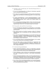 Landtag von Baden-Württemberg Drucksache 15 / 2796 II. Struktur und Verankerung der Gleichstellungsstellen in den Hochschulen 1. Wo sind die Gleichstellungsstellen im Gefüge der Hochschulen angesiedelt und wer entscheidet über ihre Besetzung? 2. Wie werden die im Landeshochschulgesetz (LHG) geregelten hochschulspezi- fischen Rechte und Pflichten der Gleichstellungsstellen vor Ort konkret umge- setzt? 3. In welchen Hochschulgremien, zu deren Mitwirkungsmöglichkeit es keine Rechtsgrundlage im LHG gibt, sind die Gleichstellungsbeauftragten und/oder eine vertretungsberechtigte Person vertreten (mit welchen Rechten, mit welchen Pflichten)? 4. Wie viele abgeschlossene Berufungsverfahren wurden in den letzten drei Jah- ren an den Hochschulen durchgeführt und an wie vielen waren die Gleichstel- lungsbeauftragten und/oder eine vertretungsberechtigte Person beteiligt? III. Personelle und sachliche Ausstattung 1. Für wie viele Studierende, Stipendiatinnen und Stipendiaten sowie Beschäftig- te sind die Gleichstellungsbeauftragten zuständig (differenziert nach Geschlecht und Hochschule)? 2. Über welche personelle und sachliche Ausstattung verfügen die Gleichstel- lungsbeauftragten und wie unterscheidet sich diese Ausstattung nach Hoch- schularten? 3. Wie werden die Gleichstellungsbeauftragten sowie die Stellvertreterinnen und Stellvertreter, Mitglieder in Gleichstellungskommissionen sowie Fakultäts- gleichstellungsbeauftragten entlastet (z. B. finanzielle Entschädigung, Depu- tatsermäßigung, sonstige Kompensation)? 4. Wie viele Drittmittel haben die Gleichstellungsbeauftragten in den vergange- nen drei Jahren eingeworben und selbständig verausgabt? 5. Wie viele Mittel wurden an unseren Hochschulen im Akademischen Jahr 2011/2012 für Gleichstellungsmaßnahmen ausgegeben (differenziert nach Bundesmitteln, Landesmitteln, Eigenmitteln der Hochschulen, Drittmitteln der DFG, sonstigen Drittmitteln)? IV. Gleichstellungsmaßnahmen 1. Welche Gleichstellungsmaßnahmen wurden mit Landesmitteln, Hochschul- mitteln, Mitteln aus dem Professorinnen-Programm, DFG-Gleichstellungsmit- teln oder sonstigen Mitteln finanziert (ohne Familienförderung)? 2. Welche Maßnahmen werden im Bereich der Familienförderung durchgeführt (z. B. Audit „Familiengerechte Hochschule“, Total-E-Quality, Benchmarking- Prozesse)? 3. Welche Gleichstellungsmaßnahmen wurden vom Wissenschaftsministerium in den letzten drei Jahren initiiert und wie wurden diese angenommen (Anzahl der Bewerbungen je Maßnahme und Zahl der Bewilligungen; z. B. Unterstützung der Antragstellung zum Professorinnen-Programm, COMENT-Programm)? 4. Wie viele und welche Gleichstellungsmaßnahmen und Genderforschungsakti- vitäten werden gegenwärtig im Rahmen des Innovations- und Qualitätsfonds des Wissenschaftsministeriums gefördert? 2
