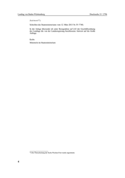 Landtag von Baden-Württemberg Drucksache 15 / 2796 Antwort*) Schreiben des Staatsministeriums vom 12. März 2013 Nr. IV-7740.: In der Anlage übersende ich unter Bezugnahme auf § 63 der Geschäftsordnung des Landtags die von der Landesregierung beschlossene Antwort auf die Große Anfrage. Krebs Ministerin im Staatsministerium *) Der Überschreitung der Sechs-Wochen-Frist wurde zugestimmt. 4