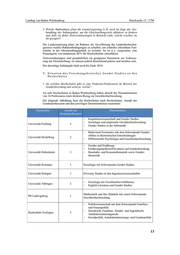 Landtag von Baden-Württemberg Drucksache 15 / 2796 5. Welche Maßnahmen plant die Landesregierung (z. B. auch im Zuge der Aus- handlung des Solidarpakts), um die Gleichstellungsziele effektiver zu fördern und, falls sie dabei Zielvereinbarungen in Betracht zieht, welche erachtet sie als geeignet? Die Landesregierung plant, im Rahmen der Novellierung des Landeshochschul- gesetzes weitere Rahmenbedingungen zu schaffen, um schneller erkennbare Fort- schritte in der Gleichstellungspolitik zu erzielen. So ist u. a. vorgesehen, eine Frauenquote von mindestens 40 % für Hochschulräte einzuführen. Zielvereinbarungen sind grundsätzlich ein geeignetes Instrument zur Verbesse- rung der Gleichstellung; sie müssen jedoch hinreichend präzise und messbar sein. Der derzeitige Solidarpakt läuft noch bis Ende 2014. V. Situation des Forschungsbereiches Gender Studies an den Hochschulen 1. An welchen Hochschulen gibt es eine Professur/Professuren im Bereich der Genderforschung und wenn ja, welche? An acht Hochschulen in Baden-Württemberg haben aktuell die Denominationen von 16 Professuren einen direkten Bezug zur Geschlechterforschung. Die folgende Abbildung fasst die Hochschulen nach Hochschulart, Anzahl der Genderprofessuren und den jeweiligen Denominationen zusammen: Hochschule Anzahl der Denomination Genderprofessuren - Kognitionswissenschaft und Gender Studies - Soziologie und empirische Geschlechterforschung Universität Freiburg 3 - Gender Studies in der Informatik - Behavioral Economics mit dem Schwerpunkt Gender- effekte in ökonomischen Entscheidungen Universität Heidelberg 2 - Differenzielle Psychologie und Geschlechterforschung - Gender und Ernährung - Ernährungsmedizin/Prävention und Genderforschung Universität Hohenheim 3 - Haushalts- und Konsumökonomik sowie Gender- ökonomik Universität Konstanz 1 Soziologie mit Schwerpunkt Gender Studies Universität Stuttgart 1 Diversity Studies in den Ingenieurwissenschaften - Soziologie der Geschlechterverhältnisse Universität Tübingen 2 - English Literature and Gender Studies Mathematik und ihre Didaktik mit einem Schwerpunkt PH Ludwigsburg 1 Geschlechterforschung - Politikwissenschaft mit dem Schwerpunkt Familien- und Frauenpolitik - Sozialrecht, Familien-, Kinder- und Jugendrecht, Hochschule Esslingen 3 Antidiskriminierungsrecht - Sozialpolitik, Antidiskriminierungs- und Genderpolitik 13