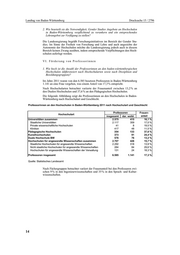 Landtag von Baden-Württemberg Drucksache 15 / 2796 Professoren an baden-württembergischen Hochschulen 2011 nach Fächergruppen und Geschlecht Organisatorische Zuordnung Fächergruppe Professoren Frauen insgesamt Anzahl Anteil Sprach- und Kulturwissenschaften 764 269 35 % Sport 29 6 21 % Rechts-, Wirtschafts- und Sozialwissenschaften 1.814 344 19 % Mathematik, Naturwissenschaften 1.332 159 12 % Humanmedizin/Gesundheitswissenschaften 436 60 14 % Agrar-, Forst- und Ernährungswissenschaften 149 29 19 % Ingenieurwissenschaften 1.493 134 9% Kunst, Kunstwissenschaft 504 121 24 % Zentrale Einrichtungen (ohne klinikspezifische Einrichtungen) 64 19 30 % Zentrale Einrichtungen der Hochschulkliniken (nur Humanmedizin) 0 0 Professoren insgesamt 6.585 1.141 17 % Quelle: Statistisches Landesamt In Bezug auf die professoralen Besoldungsgruppen zeigt sich eine höhere Beteili- gung von Frauen bei den (neuen) W-Besoldungen als bei den (alten) C-Besoldun- gen. Professoren an baden-württembergischen Hochschulen 2011 nach Besoldungsgruppen und Geschlecht Professoren Frauen- Besoldungsgruppe insgesamt dar. weibl. anteil C4 und entspr. Besoldungsgruppen 945 89 9% C3 und entspr. Besoldungsgruppen 1.370 183 13 % C2 und entspr. Besoldungsgruppen - auf Dauer - 1.000 182 18 % C2 und entspr. Besoldungsgruppen - auf Zeit - 129 44 34 % W3 1.455 315 22 % W2 1.494 267 18 % Juniorprofessoren, W1, AT 166 55 33 % Gastprofessoren (hauptberuflich), W2, W3, C2-C4, BAT IIa, 26 6 23 % E13h, E14, AT Professoren insgesamt 6.585 1.141 17 % Quelle: Statistisches Bundesamt, Fachserie 11, Reihe 4.4, Tabelle 2 2. Wie hoch war der Anteil der Professorinnen bei den Neuberufungen und wie viele Professorinnen wurden davon über das Professorinnen-Programm sowie das Ausbauprogramm Hochschule 2012 berufen? Im Zeitraum 2008 bis 2012 betrug der Frauenanteil bei den Neuberufungen 24 % (Meldungen der Hochschulen im Januar/Februar 2013). Von den im Betrach- tungszeitraum insgesamt 569 neuberufenen Frauen wurden insgesamt 152 Profes- sorinnen über das Ausbauprogramm Hochschule 2012 und das Professorinnen- programm gefördert. Der relative Anteil von neuberufenen Frauen aus den ge- nannten Programmen lag somit bei 26 %. 15