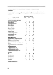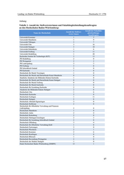 Landtag von Baden-Württemberg Drucksache 15 / 2796 Tabelle 3: Anzahl der Studierenden an den Hochschulen Baden-Württembergs Studierende Name der Hochschule Gesamt Männer Frauen Duale Hochschule Baden-Württemberg 30.841 17.646 13.195 Hochschulen für angewandte Wissenschaften 84.718 54.865 29.923 Hochschule Aalen 4.944 3.464 1.480 Hochschule Albstadt-Sigmaringen 2.899 1.696 1.203 Hochschule Biberach 2.221 1.470 751 Hochschule der Medien Stuttgart 4.136 2.116 2.020 Hochschule Esslingen 6.063 4.355 1.708 Hochschule Furtwangen 5.745 3.790 1.955 Hochschule Heilbronn 8.015 5.086 2.929 Hochschule Karlsruhe 6.857 5.356 1.501 Hochschule Kehl 1.019 351 668 Hochschule Konstanz 4.461 3.159 1.302 Hochschule Ludwigsburg 1.901 567 1.334 Hochschule Mannheim 5.113 3.540 1.573 Hochschule Nürtingen-Geislingen 4.622 2.348 2.274 Hochschule Offenburg 4.082 3.111 971 Hochschule Pforzheim 5.593 3.185 2.408 Hochschule Ravensburg-Weingarten 3.226 2.293 1.003 Hochschule Reutlingen 4.699 2.736 1.963 Hochschule Rottenburg 850 655 195 Hochschule Schwäbisch Gmünd 642 300 342 Hochschule Stuttgart 3.675 2.140 1.535 Hochschule Ulm 3.955 3.147 808 Kunst- und Musikhochschulen 4.718 2.053 2.710 Staatliche Akademie der Bildenden Künste Karlsruhe 316 139 177 Staatliche Akademie der Bildenden Künste Stuttgart 840 296 544 Staatliche Hochschule für Gestaltung Karlsruhe 438 200 238 Staatliche Hochschule für Musik Freiburg 536 224 312 Staatliche Hochschule für Musik Karlsruhe 655 312 343 Staatliche Hochschule für Musik Trossingen 456 221 235 Staatliche Hochschule für Musik und Darstellende Kunst Stuttgart 738 346 437 Staatliche Hochschule für Musik und Darstellende Kunst Mannheim 739 315 424 Pädagogische Hochschulen 24.655 5.788 18.867 Pädagogische Hochschule Freiburg 4.893 1.334 3.559 Pädagogische Hochschule Heidelberg 4.604 1.096 3.508 Pädagogische Hochschule Karlsruhe 3.249 614 2.635 Pädagogische Hochschule Ludwigsburg 5.692 1.197 4.495 Pädagogische Hochschule Schwäbisch Gmünd 2.915 682 2.233 Pädagogische Hochschule Weingarten 3.302 865 2.437 Universitäten 172.557 90.244 82.313 KIT 24.025 17.568 6.457 Universität Freiburg 24.074 11.435 12.639 Universität Heidelberg 29.488 12.834 16.654 Universität Hohenheim 9.628 4.221 5.407 Universität Konstanz 11.336 5.207 6.129 Universität Mannheim 11.880 5.371 6.509 Universität Stuttgart 24.642 16.834 7.808 Universität Tübingen 27.895 11.620 16.275 Universität Ulm 9.589 5.154 4.435 Stichtag in der Regel 1.12.2012 Quelle: Meldungen der Hochschulen im Januar/Februar 2013 19