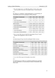 Landtag von Baden-Württemberg Drucksache 16 / 4725 3. Wie viele Verletzte gab es seit 2000 (bitte gliedern in leicht verletzt, schwer verletzt und tödlich verletzt und in Fahrradfahrer/anderer Verkehrsteilnehmer)? Zu 3.: Die Zahlen der verunglückten Verkehrsteilnehmenden im Zusammenhang mit Fahrradunfällen lassen sich der nachfolgende Tabellen entnehmen: 9HUXQJOFNWH,.DOHQGHUMDKU *HW|WHWH – davon Fahrradnutzer 50 53 42 53 45 – davon andere Verkehrsteilnehmer 2 1 3 2 1 6FKZHUYHUOHW]WH – davon Fahrradnutzer 1.859 1.996 2.032 1.978 1.854 – davon andere Verkehrsteilnehmer 80 83 90 101 78 /HLFKWYHUOHW]WH – davon Fahrradnutzer 5.718 6.201 6.378 6.700 6.938 – davon andere Verkehrsteilnehmer 395 399 418 458 427 4. Bei wie vielen Fällen liegt die Schuld beim Fahrradfahrer/Zweiten Verkehrs- teilnehmer (bitte aufgegliedert in Jahre seit 2000)? Zu 4.: Zur Beantwortung der Frage wird auf die nachfolgende Tabelle verwiesen: 9HUXQJOFNWH,.DOHQGHUMDKU *HW|WHWH Verursacher: Fahrradnutzer 38 42 29 36 33 Verursacher: Andere Verkehrsteilnehmer 14 12 16 19 13 6FKZHUYHUOHW]WH Verursacher: Fahrradnutzer 1.341 1.410 1.431 1.403 1.347 Verursacher: Andere Verkehrsteilnehmer 598 669 691 676 585 /HLFKWYHUOHW]WH Verursacher: Fahrradnutzer 3.137 3.448 3.518 3.796 3.968 Verursacher: Andere Verkehrsteilnehmer 2.976 3.152 3.278 3.362 3.397 5. In wie vielen Fällen trugen die Fahrradfahrer keinen Helm? Zu 5.: Die Helmtragequote bei Unfällen mit verunglückten Radfahrerinnen und Radfah- rern kann ausschließlich im Zusammenhang mit tödlichen Fahrradunfällen abge- bildet werden: 3