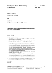 Landtag von Baden-Württemberg Drucksache 16 / 7773 16. Wahlperiode 19. 02. 2020 Kleine Anfrage des Abg. Udo Stein AfD und Antwort des Ministeriums der Justiz und für Europa Ausstattungs- und Personalsituation in der Justizvollzugsan- stalt (JVA) Schwäbisch Hall Kleine Anfrage Ich frage die Landesregierung: 1. Wie viele Fahrzeuge zum Transport von Gefangenen befinden sich aktuell im Fuhrpark der JVA Schwäbisch Hall? 2. Wie alt sind die im Fuhrpark befindlichen Fahrzeuge der JVA Schwäbisch Hall im Einzelnen (Jahr der Zulassung & aktueller Kilometerstand)? 3. Wie oft musste in den Jahren von 2015 bis 2020 der Sport für Gefangene auf- grund von Überbelegung ausfallen? 4. Wie viele Überstunden haben die einzelnen Bediensteten der JVA Schwä- bisch Hall in den Jahren von 2015 bis 2020 pro Jahr angesammelt? 5. Wie viele krankheitsbedingte Fehltage hatten die Bediensteten der JVA Schwäbisch Hall in den Jahren 2015 bis 2020 pro Jahr im Durchschnitt? 6. Für wie viele Gefangene ist ein Vollzugsbeamter in der JVA Schwäbisch Hall in der Regel pro Stockwerk allein verantwortlich? 7. Wie viele Gefangene befanden sich im Durschnitt in der JVA Schwäbisch Hall in den Jahren von 2015 bis 2020? 8. Für wie viele Gefangene ist die JVA in der Maximalbelegung ausgelegt? 9. Wie viele Justizvollzugsbeamte der JVA Schwäbisch Hall gingen in den Jah- ren von 2010 bis 2020 in Frühpension, obwohl sie das angesetzte Rentenalter noch nicht vollständig erreicht hatten? 10. Wie viele Justizvollzugsbeamte sollten aktuell laut Belegungsschlüssel in der JVA Schwäbisch Hall tätig sein und wie viele sind es aktuell tatsächlich? 19. 02. 2020 Stein AfD Eingegangen: 19. 02. 2020 / Ausgegeben: 24. 03. 2020 1 Drucksachen und Plenarprotokolle sind im Internet Der Landtag druckt auf Recyclingpapier, ausgezeich- abrufbar unter: www.landtag-bw.de/Dokumente net mit dem Umweltzeichen „Der Blaue Engel“.