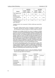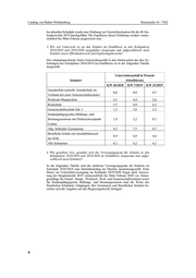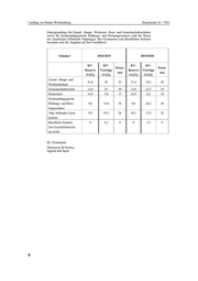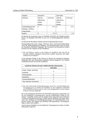 Landtag von Baden-Württemberg Drucksache 16 / 7562 Schulart 2018/2019 2019/2020 Rektorate Zahl der In Prozent Zahl der In Prozent unbesetzten unbesetzten Stellen Stellen absolut absolut Sonderpädagogisches 4 14 % 4 14 % Bildungs- und Bera- tungszentrum gesamt 8 3% 7 3% Im Bereich der Gymnasien waren im Schuljahr 2018/2019 alle Schulleiterstellen besetzt. Im Schuljahr 2019/2020 ist eine von 14 Schulleitungsstellen unbesetzt (7 %). Im Bereich der Beruflichen Schulen sind alle Schulleiterstellen besetzt. Datengrundlage für Grund-, Haupt-, Werkreal-, Real- und Gemeinschaftsschulen sowie für Sonderpädagogische Bildungs- und Beratungszentren sind die Werte des Staatlichen Schulamts Göppingen. Bei Gymnasien und Beruflichen Schulen beziehen sich die Angaben auf den Ostalbkreis. 8. Wie viele Klassen wurden an den Schulen im Ostalbkreis über dem für die jeweilige Schulart festgelegten Klassenteiler gebildet (insgesamt und aufge- schlüsselt nach Schulart)? In der folgenden Tabelle ist die Zahl der im Bereich des Staatlichen Schulamts Göppingen über den Klassenteiler gebildeten Klassen dargestellt. Die Schulart Gymnasium bezieht sich auf den Ostalbkreis. Anzahl der Klassen mit einer Schülerzahl über Klassenteiler 2019/2020 Grund-, Haupt- und Werk- 4 realschule Werkrealschule 0 Realschule 2 Gemeinschaftsschule 3 Allg. bildendes Gymnasium 9 9. Wie viele Lehrerstellen (Vollzeitäquivalente) waren bzw. sind ihm Rahmen der Vertretungsreserve an Schulen im Ostalbkreis in den Schuljahren 2018/2019 und 2019/2020 im Einsatz und wie viele waren demgegenüber von den Schulen in diesem Zeitraum angefragt? Die in den Schuljahren 2018/2019 und 2019/2020 eingesetzten Lehrerstellen aus der fest installierten Vertretungsreserve sind der nachstehenden Tabelle zu ent- nehmen. Aufgeführt wurden auch die darüber hinaus abgeschlossenen befristeten Verträge zur Krankheitsvertretung. Ausfälle können allerdings auch durch Mehr- arbeit oder Erhöhung des Beschäftigungsumfanges bei Stammlehrkräften kom- pensiert werden. Die Angabe einer absoluten Zahl angeforderter Vertretungsum- fänge ist daher nicht möglich. Auch in diesem Schuljahr war ein Großteil der Vertretungsreserve bereits zu Schul- jahresbeginn eingesetzt. 7