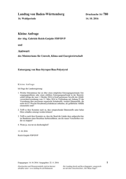 Landtag von Baden-Württemberg Drucksache 16 / 780 Antwort Mit Schreiben vom 8. November 2016 Nr. 25-8973.10/35 beantwortet das Minis- terium für Umwelt, Klima und Energiewirtschaft im Einvernehmen mit dem Wirtschaftsministerium die Kleine Anfrage wie folgt: 1. Welche Erkenntnisse hat sie über einen möglichen Entsorgungsnotstand, Ent- sorgungsprobleme oder einen erhöhten Entsorgungsaufwand in der Bauwirt- schaft infolge der zum 1. Oktober 2016 in Kraft getretenen Novelle der Abfall- verzeichnisverordnung vom 11. März 2016 in Verbindung mit Anhang IV der Verordnung über persistente organische Schadstoffe, wonach Dämmstoffe, die mehr als 0,1 Prozent Hexabromcyclododecan enthalten, als gefährliche Abfälle einzustufen sind? In der Zeit von März 2016 bis etwa nach der Sommerpause 2016 erhielt das Um- weltministerium keine konkreten Hinweise auf einen etwaigen Entsorgungsnot- stand. Erst im September haben einige Entsorgungsbetriebe, die Abfall-Container auf Baustellen aufstellen, die Annahme von HBCD-haltigen expandierten Poly- styrol-Hartschaum-(EPS)-Dämmplatten und extrudierten Polystyrol-Hartschaum- (XPS)-Dämmplatten verweigert. Grund dafür war u. a. die Verweigerung der An- nahme dieser Abfälle bei den Müllverbrennungsanlagen zur energetischen Ver- wertung oder bei den Behandlungsanlagen der privaten Entsorgungswirtschaft, die eine Konditionierung der Abfälle für die spätere Verbrennung durchführen. Zugleich wurden am Markt deutlich erhöhte Entsorgungspreise verlangt. In Fach- kreisen wird dazu nach Kenntnis des Umweltministeriums die Meinung vertreten, dass es sich weniger um ein konkretes Entsorgungsproblem handelt als vielmehr um eine Reaktion des Marktes auf vollständig ausgelastete thermische Behand- lungs- oder Verwertungsanlagen. Dabei ist allerdings zu berücksichtigen, dass nach Kenntnis des Umweltministe- riums weder den Verbänden der Wirtschaft noch den Behörden belastbare Infor- mationen über die tatsächlichen Mengen an HBCD-haltigen Dämmstoffen vorlie- gen. Das Umweltministerium wird die weitere Entwicklung der Lage daher sorg- fältig beobachten. 2. Trifft es ihrer Kenntnis nach zu, dass entsprechende Dämmstoffe unter hoher Hitze schadlos entsorgt werden können? Nach Kenntnis und Einschätzung des Umweltministeriums trifft dies zu, denn Verbrennungsversuche von HBCD-haltigen EPS-Dämmplatten und XPS-Dämm- platten im Müllheizkraftwerk Würzburg (Volltitel des Berichts: Destruction of the flame retardant hexabromocyclododecane in a full-scale municipal solid waste incinerator, Waste Management & Research, 2015, Vol. 33[2] 165–174) haben gezeigt, dass derartige Abfälle in Hausmüllverbrennungsanlagen energetisch ver- wertet werden können. Bei Zugabe von 0,7 bis max. 2,4 Gew.-% HBCD-haltigen EPS- und XPS-Dämmplatten wurde in den Versuchen gezeigt, dass ein ungestör- ter Anlagenbetrieb gewährleistet ist und das HBCD bei den in der Anlage vor- herrschenden Temperaturen zerstört wird. Die Publikation der vorgenannten Ver- brennungsversuche zu HBCD-haltigen EPS- und XPS-Dämmplatten im Müll- heizkraftwerk Würzburg hat auch im internationalen Bereich Anwendung gefun- den. So wurde im Mai 2015 bei der UNEP Basel POP Konferenz (COP 12) in Genf die Mitverbrennung von HBCD-haltigen Dämmplatten in Hausmüllverbren- nungsanlagen diskutiert und als weltweit akzeptierte Zerstörungsmethode für HBCD in die General Technical Guidelines zum Basler Übereinkommen unter G.2.b aufgenommen. 2