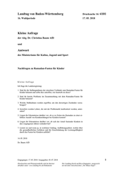 Landtag von Baden-Württemberg Drucksache 16 / 4101 Begründung Wie bereits seit Jahren, warnen auch in diesem Jahr vor Beginn des Ramadan am 16. Mai 2018, viele Verbände, darunter der Berufsverband der Kinder- und Ju- gendärzte, vor dem Ramadan-Fasten bei Kindern. Die Fastenpflicht gilt für alle Muslime ab der Religionsmündigkeit, was dem Alter von etwa 14 Jahren ent- spricht. Ausgeschlossen von der Pflicht sind nur Reisende, Schwangere, stillende Mütter, Kinder, Kranke und Alte. Laut Angaben der Jugendärzte werden Kinder, die die Pubertät noch nicht erreicht haben, oft ermutigt, so viele Tage zu fasten, wie sie können. Vielfach sollen entsprechende Erwartungen der Familie auf den Mädchen und Jungen lasten. Die Mediziner fordern, dass Eltern ihren Kindern auch tagsüber genügend zu trin- ken geben. Das Fasten über den ganzen Tag, vor allem bei erhöhten Temperatu- ren, schädigt zum einen die Gesundheit von Kindern und Jugendlichen und ge- fährdet zum anderen auch die schulischen Leistungen. Hinzu kommt, laut den Ärzten, dass die Kinder aufgrund der abendlichen Rituale unter Schlafmangel leiden. Die Kinder sollen mit körperlichen Schmerzen, wie starken Kopf- und Bauch- schmerzen, bis hin zu einem Kreislaufkollaps kämpfen und so nicht in der Lage sein, dem Unterricht zu folgen. In diesem Jahr fällt der Ramadan zudem in die Zeit der wichtigsten Wochen des Schuljahrs. Es werden entscheidende Klassen- arbeiten vor der Versetzung geschrieben und es finden Sportwettbewerbe statt. Es gilt zu ergründen, ob der Landesregierung Stellungnahmen der Verbände be- kannt sind und ob diese Maßnahmen ergreift, um die Zustände der betroffenen Kinder zu verbessern. Antwort Mit Schreiben vom 12. Juni 2018 Nr. 31-6600.0/283/1 beantwortet das Ministe- rium für Kultus, Jugend und Sport die Kleine Anfrage wie folgt: Ich frage die Landesregierung: 1. Sind ihr die Stellungnahmen der einzelnen Verbände zum Ramadan-Fasten für Kinder bekannt und sollte dies zutreffen, wie beurteilt sie diese? 2. Sind ihr bereits Probleme im Zusammenhang mit dem Ramadan-Fasten für Kinder bekannt? 3. Welche Maßnahmen werden ergriffen, um den derzeitigen Zuständen vorzu- beugen? Das Kultusministerium war als oberste Schulaufsichtsbehörde bisher nur verein- zelt mit der Thematik des Fastens im Monat Ramadan durch Schülerinnen und Schüler muslimischen Glaubens befasst. Hierbei ging es insbesondere um die Teilnahme am Sport- und Schwimmunterricht. In diesem Zusammenhang war das Kultusministerium mit von kinder- und jugendmedizinischen Auffassungen zum Fasten im Monat Ramadan befasst. Die Mannigfaltigkeit der jeweils auftretenden Sachverhalte erfordert eine Abwä- gung im Einzelfall und steht der Einführung einem davon losgelösten generellen Handlungsleitfaden, der über bloße Hinweise mit empfehlendem Charakter hin- ausgeht, entgegen. Gemäß Art. 4 Abs. 1 und 2 Grundgesetz (GG) sind die Freiheit des Glaubens so- wie die Freiheit des religiösen Bekenntnisses unverletzlich. Außerdem wird die ungestörte Religionsausübung gewährleistet. Die Glaubensfreiheit beinhaltet nach der Rechtsprechung des Bundesverfassungsgerichts „auch das Recht des Einzel- 2