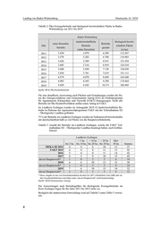 Landtag von Baden-Württemberg Drucksache 16 / 8554 Tabelle 2: Öko-Erzeugerbetriebe und ökologisch bewirtschaftete Fläche in Baden- Württemberg von 2011 bis 2019 Baden-Württemberg landwirtschaftliche ökologisch bewirt- reine Streuobst- Betriebe Jahr Betriebe schaftete Fläche betriebe gesamt (ohne Streuobst) (in ha) 2011 3.430 3.079 6.509 112.567 2012 3.578 3.202 6.780 116.983 2013 3.626 3.289 6.915 121.454 2014 3.603 3.316 6.919 124.534 2015 3.680 3.450 7.130 130.436 2016 3.838 3.781 7.619 151.111 2017 4.579 4.070 8.649 165.640 2018 4.985 4.305 9.290 174.464 2019 5.829 4.542 10.371 186.905 Quelle: RP K Öko-Kontrollstatistik Für eine detaillierte Auswertung nach Flächen und Gemarkungen werden die Da- ten des Antragsverfahrens zum Gemeinsamen Antrag (GA) im Förderprogramm für Agrarumwelt, Klimaschutz und Tierwohl (FAKT) herangezogen. Nicht alle Betriebe im Öko-Kontrollverfahren stellen einen Antrag in FAKT. Im Landkreis Esslingen wurden im Antragsjahr 2019 52 landwirtschaftliche Be- triebe im Rahmen des Agrarumweltprogramms FAKT mit der Teilmaßnahme D2 – Ökologischer Landbau gefördert. 75 % der Betriebe im Landkreis Esslingen werden im Nebenerwerb bewirtschaftet mit durchschnittlich halb so viel Fläche wie die Haupterwerbsbetriebe. Tabelle 3: Anzahl der Betriebe im Landkreis Esslingen, welche die FAKT Teil- maßnahme D2 – Ökologischer Landbau beantragt haben, nach Größen- klassen Landkreis Esslingen > 5 ha > 10 ha > 20 ha über bis 5 ha bis 10 ha bis 20 ha bis 50 ha 50 ha Summe MEKA III 2014 4 4 6 10 13 37 FAKT 2015 6 4 8 11 13 42 2016 5 4 8 11 14 42 2017 6 5 9 10 15 45 davon Haupterwerb* 1 0 2 5 6 14 2018 6 6 10 13 15 50 davon Haupterwerb* 1 0 2 5 6 14 2019 7 6 10 15 14 52 davon Haupterwerb* 2 0 2 5 6 15 * Diese Angabe ist nur von Einzelunternehmen ab dem GA 2017 erforderlich. Eine GbR oder an- dere Gesellschaftsformen sind daher unter „davon Haupterwerb“ nicht berücksichtigt. Quelle: MLR (Gemeinsamer Antrag) Die Auswertungen nach Betriebsgrößen für ökologische Erzeugerbetriebe im Kreis Esslingen liegen für die Jahre 2011 bis 2013 nicht vor. Bezüglich der landesweiten Entwicklung wird auf Tabelle 5 unter Ziffer 5 verwie- sen. 4