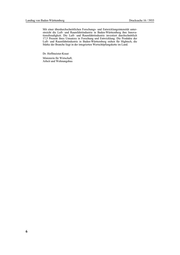 Landtag von Baden-Württemberg Drucksache 16 / 5935 Mit einer überdurchschnittlichen Forschungs- und Entwicklungsintensität unter- streicht die Luft- und Raumfahrtindustrie in Baden-Württemberg ihre Innova- tionsfreudigkeit. Die Luft- und Raumfahrtindustrie investiert durchschnittlich 17,5 Prozent ihres Umsatzes in Forschung und Entwicklung. Die Produkte der Luft- und Raumfahrtindustrie in Baden-Württemberg stehen für Hightech, die Stärke der Branche liegt in der integrierten Wertschöpfungskette im Land. Dr. Hoffmeister-Kraut Ministerin für Wirtschaft, Arbeit und Wohnungsbau 6