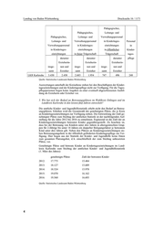 Landtag von Baden-Württemberg Drucksache 16 / 1171 Betreuungsquote für Kinder unter 3 Jahren 2012 2013 2014 2015 2016 LKR Karlsruhe 25,5 26,6 29,7 30,1 30,3 Betreuungsquote für Kinder im Alter von 3 bis unter 6 Jahren 2012 2013 2014 2015 2016 LKR Karlsruhe 94,8 95,1 94,4 95,9 95,2 Quelle: Statistisches Landesamt Baden-Württemberg Für den Wahlkreis Ettlingen liegen keine Zahlen vor. 3. Wie wird sich die Betreuungsquote im Wahlkreis Ettlingen und im Landkreis Karlsruhe in den kommenden fünf Jahren voraussichtlich verändern? Das Landratsamt Karlsruhe hat zu der Frage Folgendes ausgeführt: „Der Wahlkreis Ettlingen besteht aus den Städten und Gemeinden Ettlingen, Karlsbad, Malsch, Marxzell, Pfinztal, Rheinstetten und Waldbronn. Der Ausbau- stand der Betreuungsangebote in den einzelnen Kommunen ist unterschiedlich. Der Ausbaubedarf wird vor allem bei den Platzangeboten für U3-Kinder liegen, nicht zuletzt, weil die durch Kleinkinder belegten Plätze in den altersgemischten Gruppen zunehmend von Ü3-Kindern benötigt werden. Nach einer Abfrage des Jugendamtes im Landkreis Karlsruhe planen die Kommunen im gesamten Land- kreis bis zum 1. August 2017 einen Ausbau der U3-Plätze um 7,5 Prozent, die Kommunen im Wahlkreis Ettlingen um 7 Prozent. Nach einer landesweiten Über- sicht des Kommunalverbandes für Jugend und Soziales hat der Landkreis Karls- ruhe bereits einen guten Ausbaustand erreicht und steht im Ranking der baden- württembergischen Landkreise im oberen Drittel. Zu berücksichtigen ist die zahlenmäßige Zunahme der Altersgruppe der Kinder bis 6 Jahren. Sie hat im Landkreis Karlsruhe und im Wahlkreis Ettlingen gleicher- maßen zugenommen, sodass sich die Zunahme des Platzangebots im letzten Kin- dergartenjahr nur ganz geringfügig auf die Betreuungsquote ausgewirkt hat. Das Jugendamt des Landkreises Karlsruhe sieht in den kommenden Jahren keinen nennenswerten unterschiedlichen Entwicklungsbedarf im gesamten Landkreis bzw. im Wahlkreis Ettlingen. Die Zahl der Betreuungsplätze in öffentlicher Verantwor- tung und die Betreuungsquote (vor allem bei U3) werden weiter zunehmen, im Vergleich zu den Entwicklungen bis zum 1. August 2013 (Einführung Rechtsan- spruch) aber eher abflachen. In einigen wenigen Kommunen, auch im Wahlkreis Ettlingen, ist angesichts eines unterdurchschnittlichen Ausbaustandes von einem stärkeren Nachholbedarf auszugehen. Genauere Prognosen über einen 5-jährigen Zeitraum sind uns nicht möglich. Neben der allgemeinen Anpassung des Platzangebotes wird in den kommenden Jahren der Ausbau der Ganztagesplätze im Rahmen dieses Angebotes zunehmend an Bedeutung gewinnen.“ 4. Wie viele Erzieherinnen und Erzieher sind im Wahlkreis Ettlingen und Land- kreis Karlsruhe in den einzelnen Gemeinden beschäftigt? Die Gesamtzahl der Personen des Pädagogischen, Leitungs- und Verwaltungs- personals an Kindertageseinrichtungen und darunter die Zahl der ausgebildeten Erzieherinnen und Erzieher zum Stichtag 1. März 2016 kann der folgenden Über- sicht entnommen werden: 3