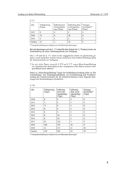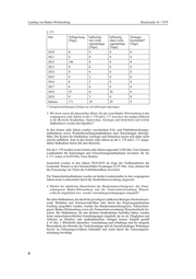 Landtag von Baden-Württemberg Drucksache 16 / 7479 L 171 Jahr Vollsperrung halbseitig mit halbseitig ohne Tonnage- [Tage] Lichtsignalan- Lichtsignalan- beschränkt* lage [Tage] lage [Tage] [Tage] 2017 0 0 0 0 2018 25 0 28 0 2019 0 3 0 0 Summe 25 3 28 0 * Tonnagebeschränkungen erfolgten nur mit halbseitigen Sperrungen Bei den Sperrungen auf der L 171 stand für den Verkehr bis 3,5 Tonnen jeweils ein Gemeindeweg als kurze Umleitungsstrecke zur Verfügung. Die L 170 und die L 171 waren in den angegebenen Zeiten nie gleichzeitig ge- sperrt. Somit stand dem Verkehr immer mindestens eine Straßenverbindung durch die Wutachschlucht zur Verfügung. 2. An wie vielen Tagen waren die L 170 und L 171 wegen Menschengefährdung wie beispielsweise Steinschlag in den vergangenen zehn Jahren gesperrt (auf- geschlüsselt nach Jahren)? Daten zu „Menschengefährdung“ liegen der Straßenbauverwaltung nicht vor. Für Unterhaltungs- und Erhaltungsmaßnahmen zur Gewährleistung und Wiederher- stellung der Verkehrssicherheit für die Verkehrsteilnehmer waren folgende Sper- rungen und Beschränkungen erforderlich. L 170 Jahr Vollsperrung halbseitig halbseitig Tonnage- [Tage] mit Licht- ohne Licht- beschränkt* signalanlage signalanlage [Tage] [Tage] [Tage] 2010 0 0 0 0 2011 3 0 0 0 2012 75 0 0 0 2013 0 0 0 0 2014 0 0 0 0 2015 0 34 0 0 2016 0 28 0 0 2017 82 220 0 0 2018 166 105 28 0 2019 12 215 61 20 Summe 338 602 89 20 * Tonnagebeschränkungen erfolgten nur mit halbseitigen Sperrungen 3