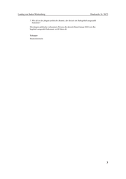 Landtag von Baden-Württemberg Drucksache 16 / 9675 Antwort Mit Schreiben vom 3. Februar 2021 Nr. 1P-0311.53/LT-Anfarge beantwortet das Staatsministerium im Einvernehmen mit dem Ministerium für Finanzen die Kleine Anfrage wie folgt: 1. Wie viele politische Beamte wurden in der 16. Legislaturperiode bis zum Tag der Beantwortung der Kleinen Anfrage jeweils jährlich frühpensioniert? In der 16. Legislaturperiode wurden neun politische Beamte in den einstweiligen Ruhestand versetzt. 2. Welche jährlichen Kosten sind für das Land Baden-Württemberg durch die neu- en Frühpensionierungen in der aktuellen Legislatur pro Jahr angefallen? Folgende Kosten sind im Rahmen der Beamtenversorgung für die sich im einst- weiligen Ruhestand befindlichen Personen, welche in der aktuellen Legislaturperi- ode in den einstweiligen Ruhestand versetzt wurden, angefallen: 2016 2017 2018 2019 2020 2021 (ab Legislaturbeginn) (bis 31.01.2021) 257.167,80 € 233.906,30 € 215.131,77 € 343.185,91 € 432.696,54 € 33.328,18 € 3. Wie viele ehemalige politische Beamte befinden sich im einstweiligen Ruhestand und erhalten zum Tag der Beantwortung der Kleinen Anfrage ein Ruhegehalt vom Land Baden-Württemberg? Es befinden sich sieben politische verbeamtete Personen im einstweiligen Ruhe- stand, welche derzeit (Stand Januar 2021) ein Ruhegehalt ausgezahlt bekommen. 4. Welche jährlichen Kosten sind für das Land Baden-Württemberg einschließlich der neuen Frühpensionierungen der aktuellen Legislatur pro Jahr angefallen? Folgende Kosten sind im Rahmen der Beamtenversorgung für die sich im einst- weiligen Ruhestand befindlichen Personen angefallen: 2016 2017 2018 2019 2020 2021 (ab Legislaturbeginn) (bis 31.01.2021) 491.542,52 € 591.143,83 € 621.247,82 € 725.003,76 € 647.114,42 € 47.786,88 € 5. Wie alt war der jüngste politische Beamte, der in der 15. Legislaturperiode frühpensioniert wurde, zum Zeitpunkt seiner Pensionierung (vgl. Drucksache 16/94)? Die jüngste politische verbeamtete Person, die in der 15. Legislaturperiode früh- pensioniert wurde, war zum Zeitpunkt ihrer Pensionierung 53 Jahre alt. 6. Wie alt war der jüngste politische Beamte, der in der 16. Legislaturperiode frühpensioniert wurde, zum Zeitpunkt seiner Pensionierung? Die jüngste politische verbeamtete Person, die in der 16. Legislaturperiode früh- pensioniert wurde, war zum Zeitpunkt ihrer Pensionierung 51 Jahre alt. 2