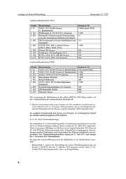 Landtag von Baden-Württemberg Drucksache 16 / 7278 Brückenbauwerke Land 2019: Straße Bezeichnung Kosten in T€ L 398 Sanierung der Unterführung des Neckars 450 (Anteil 2019) (Dammstraße) in Horb a. N. Brückenbauwerke Bund 2019: Straße Bezeichnung Kosten in T€ B 462 Sanierung der Unterführung der Murg in 1.200 Baiersbronn Brückenbauwerke Land 2020: Straße Bezeichnung Kosten in T€ L 93 Ersatzneubau der Unterführung des oberen 700 Wildschapbachs bei Wildschapbach L 398 Sanierung der Unterführung des Neckars 1.200 (Anteil 2020) (Dammstraße) in Horb a. N. L 460 Sanierung der Unterführung der DB bei 500 Freudenstadt Brückenbauwerke Bund 2020: Straße Bezeichnung Kosten in T€ B 28 Sanierung der Überführung des Fußweges 200 „Abendwiese“ bei Kniebis B 294 Unterführung des Lautertals bei Freudenstadt 500 (Austausch Übergangskonstruktion) B 294 Verstärkung der Manbachbrücke bei 700 Freudenstadt Die Umsetzung der Maßnahmen in den Jahren 2020 bis 2022 hängt zudem von der Verabschiedung der entsprechenden Haushalte ab. 6. Welche Mittel hat sie für Landesstraßenabschnitte im Landkreis Freudenstadt laut Erhaltungsmanagement für 2019 bis 2022 eingeplant (mit Angabe der ge- planten Maßnahme und der jeweiligen Kosten)? Die Erhaltungsprogramme für die Landesstraßen werden jährlich aufgestellt. Die Maßnahmen für 2020 befinden sich derzeit in der Abstimmung mit den Verkehrs- behörden, der Polizei und weiteren Projektbeteiligten. Eine abschließende Erhal- tungsliste für das Jahr 2020 kann erst nach Abschluss der Abstimmungsgespräche erstellt werden. Für die Jahre 2021 und 2022 liegen noch keine konkreten Pro- gramme vor. 5