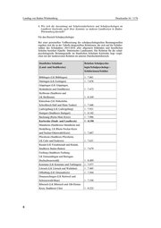 Landtag von Baden-Württemberg Drucksache 16 / 1176 6. Wie sich die Ausstattung mit Schulsozialarbeitern und Schulpsychologen im Landkreis Karlsruhe nach ihrer Kenntnis zu anderen Landkreisen in Baden- Württemberg darstellt? Für den Bereich Schulpsychologie: Bei einer personellen Vollbesetzung der schulpsychologischen Beratungsstellen ergeben sich die in der Tabelle dargestellten Relationen, die sich auf die Schüler- zahlen des Schuljahres 2015/2016 aller allgemein bildenden und beruflichen Schulen beziehen (Quelle: Statistisches Landesamt). Die Relation für die schul- psychologische Beratungsstelle im Staatlichen Schulamt Karlsruhe liegt vergli- chen mit der landesweiten Relation im unteren Durchschnittsbereich. Staatliches Schulamt Relation Schulpsycho- (Land- und Stadtkreise) login/Schulpsychologe : Schülerinnen/Schüler Böblingen (LK Böblingen) 1 : 7.861 Nürtingen (LK Esslingen) 1 : 7.878 Göppingen (LK Göppingen, Heidenheim und Ostalbkreis) 1 : 7.473 Heilbronn (Stadtkreis und LK Heilbronn) 1 : 8.169 Künzelsau (LK Hohenlohe, Schwäbisch-Hall und Main-Tauber) 1 : 7.446 Ludwigsburg (LK Ludwigsburg) 1 : 7.921 Stuttgart (Stadtkreis Stuttgart) 1 : 8.142 Backnang (Rems-Murr-Kreis) 1 : 7.986 Karlsruhe (Stadt- und Landkreis) 1 : 8.190 Mannheim (Stadtkreise Mannheim und Heidelberg, LK Rhein-Neckar-Kreis und Neckar-Odenwald-Kreis) 1 : 7.687 Pforzheim (Stadtkreis Pforzheim, LK Calw und Enzkreis) 1 : 7.631 Rastatt (LK Freudenstadt und Rastatt, Stadtkreis Baden-Baden) 1 : 7.679 Freiburg (Stadtkreis Freiburg, LK Emmendingen und Breisgau- Hochschwarzwald) 1 : 8.489 Konstanz (LK Konstanz und Tuttlingen) 1 : 7.977 Lörrach (LK Lörrach und Waldshut) 1 : 7.405 Offenburg (LK Ortenaukreis) 1 : 7.564 Donaueschingen (LK Rottweil und Schwarzwald-Baar) 1 : 7.358 Biberach (LK Biberach und Alb-Donau- Kreis, Stadtkreis Ulm) 1 : 8.222 6