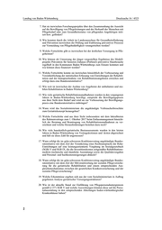 Landtag von Baden-Württemberg Drucksache 16 / 4525 7. Hat sie inzwischen Forschungsprojekte über den Zusammenhang der Aussicht auf die Bewilligung von Pflegeleistungen und der Herkunft der Menschen mit Pflegebedarf oder zum Gesundheitsstatus von pflegenden Angehörigen initi- iert bzw. gefördert? 8. Wie konnten durch die Arbeit im Landesausschuss für Gesundheitsförderung und Prävention inzwischen die Prüfung und Etablierung präventiver Prozesse zur Vermeidung von Pflegebedürftigkeit vorangetrieben werden? 9. Welche Fortschritte gibt es inzwischen bei der ärztlichen Versorgung in Pfle- geheimen? 10. Wie können als Umsetzung der jüngst vorgestellten Ergebnisse des Modell- projekts Prävention für Senioren Zuhause (PräSenZ) präventive Hausbesuche regelhaft in den Kommunen Baden-Württembergs zum Einsatz kommen und wie können diese finanziert werden? 11. Welche Fortschritte konnte sie inzwischen hinsichtlich der Verbesserung und Vereinheitlichung der statistischen Erfassung von Einrichtungen der Rehabili- tation und der Inanspruchnahme von Rehabilitationsangeboten erreichen und erfolgt dazu eine Bundesratsinitiative? 12. Wie weit ist inzwischen der Ausbau von Angeboten der ambulanten und mo- bilen Rehabilitation in Baden-Württemberg? 13. Wie viele geriatrische Rehabilitationsmaßnahmen wurden in den vergangenen Jahren in Baden-Württemberg bewilligt, entspricht die Bewilligungspraxis aus ihrer Sicht dem Bedarf und wird sie zur Verbesserung der Bewilligungs- praxis eine Bundesratsinitiative einbringen? 14. Wann wird das Sozialministerium die angekündigte Verbraucherbroschüre zum Geriatriekonzept herausgeben? 15. Welche Fortschritte sind aus ihrer Sicht insbesondere mit dem Inkrafttreten des Rahmenvertrags zum 1. Oktober 2017 beim Entlassmanagement hinsicht- lich der Beratung und Beantragung von Rehabilitationsmaßnahmen zu ver- zeichnen und welche Herausforderungen bestehen dazu noch? 16. Wie viele hausärztlich-geriatrische Basisassessments wurden in den letzten Jahren in Baden-Württemberg von Vertragsärztinnen und -ärzten abgerechnet und hält sie diese Zahl für angemessen? 17. Wann erfolgt die im grün-schwarzen Koalitionsvertrag angekündigte Bundes- ratsinitiative mit dem Ziel der Verankerung eines Rechtsanspruchs der Reha- Einrichtungen auf eine leistungsorientierte Vergütung im Sozialgesetzbuch (SGB) V und SGB IX, die die Investitionskosten zeitgemäßer Rehabilitations- medizin (technische und räumliche Ausstattung) sowie die Qualitätsvorgaben und Personal- und Sachkostensteigerungen abdeckt? 18. Wann erfolgt die im grün-schwarzen Koalitionsvertrag angekündigte Bundes- ratsinitiative mit dem Ziel der Mitverantwortung der sozialen Pflegeversiche- rung für die geriatrische Rehabilitation und einem entsprechenden Aus- gleichsmechanismus zwischen der gesetzlichen Krankenversicherung und der sozialen Pflegeversicherung? 19. Welche Erkenntnisse ergeben sich aus der vom Sozialministerium in Auftrag gegebenen Analyse geriatrischer Versorgungsstrukturen? 20. Wie ist der aktuelle Stand zur Einführung von Pflegepersonaluntergrenzen gemäß § 137 i SGB V und welche Auswirkungen könnten diese auf die Perso- nalausstattung in den entsprechenden Abteilungen baden-württembergischer Krankenhäuser haben? 2