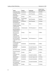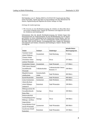 Landtag von Baden-Württemberg Drucksache 16 / 8934 aktuelle Daten- Schule Schulart Schulträger übertragungsrate Grundschule Höfen Grundschule Stadt Winnenden 103 Mbit/s Lessing-Gymnasium Gymnasium Stadt Winnenden 100 Mbit/s Winnenden Paulinenpflege Sonstige Privat 100 Mbit/s Winnenden Robert-Böhringer- Gemeinschafts- Stadt Winnenden 100 Mbit/s Gemeinschaftsschule schule Stöckachschule Grundschule Stadt Winnenden 103 Mbit/s Berufsbildungswerk und Schulen Pauli- Sonstige Privat 100 Mbit/s nenpflege Winnenden Volkshochschule Winnenden Leuten- Volkshochschule VHS Winnenden e.V. 400 Mbit/s bach Schwaikheim Stadtjugendmusik- und Kunstschule Sonstige Privat 10 Mbit/s Winnenden und Umgebung Volkshochschule Winnenden Leuten- bach Schwaikheim Volkshochschule VHS Winnenden e.V. 103 Mbit/s Außenstelle Wiesen- straße Nachbarschaftsschule in den Berglen, Grundschule Gemeinde Berglen 30 Mbit/s Oppelsbohm Grundschule Grundschule Gemeinde Burgstetten 93 Mbit/s Burgstetten Gemeinde Kernen im Karl-Mauch-Schule Grundschule 120 Mbit/s Remstal Theodor-Dierlamm- Sonstige Privat 83 Mbit/s Schule Grundschule Nell- Grundschule Gemeinde Leutenbach 6 Mbit/s mersbach Murrtal-Schule Grundschule Gemeinde Oppenweiler 238 Mbit/s Grundschule Grundschule Gemeinde Remshalden 209 Mbit/s Grunbach Realschule Remshal- Realschule Gemeinde Remshalden 265 Mbit/s den-Geradstetten Ausbildungszentrum Sonstige Privat 197 Mbit/s Bauwirtschaft 4
