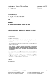 Landtag von Baden-Württemberg Drucksache 16 / 6978 Antwort Mit Schreiben vom 21. Oktober 2019 Nr. 35-/6411.8/533/1 beantwortet das Minis- terium für Kultus, Jugend und Sport die Kleine Anfrage wie folgt: Ich frage die Landesregierung: 1. Welche Gemeinschaftsschulen gibt es im nördlichen Landkreis Karlsruhe, dar- gestellt jeweils mit Angaben zum Jahr ihrer Einrichtung und zu ihrer Gesamt- schülerzahl? 2. Wie viele Schülerinnen und Schüler sowie Klassenzüge haben diese Standorte jeweils pro Klassenstufe? Für die Beantwortung der Ziffern 1 und 2 wird auf die Anlage verwiesen. 3. Welche Optionen, an allgemein bildenden oder beruflichen Gymnasien zum Abitur zu gelangen, haben die Schülerinnen und Schüler dieser Gemeinschafts- schulstandorte im Umkreis, jeweils mit Angaben zur Distanz zu den anderen Schulstandorten? Allgemein bildende Gymnasien Schülerinnen und Schüler aus den Orten der Gemeinschaftsschulen können ein allgemein bildendes Gymnasium erreichen. Dies ist ihnen gleichermaßen möglich wie anderen Kindern und Jugendlichen aus diesen Orten, die als weiterführende Schule ein Gymnasium besuchen. Für die einzelnen Schulen stellt sich dies fol- gendermaßen dar: – Gemeinschaftsschule in Eggenstein-Leopoldshafen: Schülerinnen und Schüler können das Gymnasium Neureut (8 km, ca. 15 bis 20 Min.) und das Humboldt-Gymnasium Karlsruhe (11 km, ca. 20 Min.) besu- chen. – Gemeinschaftsschule in Weingarten: Schülerinnen und Schüler können das Markgrafen-Gymnasium Karlsruhe-Dur- lach (7 km, ca. 10 bis 20 Min.) besuchen. – Gemeinschaftsschule Gondelsheim und Gemeinschaftsschule Bretten: Schülerinnen und Schüler können die beiden Gymnasien, Melanchthon- und Edith-Stein-Gymnasium, in Bretten (von Gondelsheim 10 km, ca. 20 Min.) be- suchen. – Gemeinschaftsschulen in Forst/Hambrücken, Graben-Neudorf, Kraichtal und Bruchsal: Schülerinnen und Schüler können die beiden Gymnasien, Justus-Knecht- und Schönborn-Gymnasium, in Bruchsal (von Forst 5 km, ca. 10 bis 25 Min./von Hambrücken 10 km, 15 bis 35 Min./von Graben-Neudorf 10 km, ca. 15 Min./ von Kraichtal 15 km, 20 bis 40 Min.) besuchen. – Gemeinschaftsschule in Bad Schönborn: Schülerinnen und Schüler können das Leibniz-Gymnasium in Östringen (6 km, 15 bis 30 Min.) besuchen. – Gemeinschaftsschulen in Waghäusel und Oberhausen-Rheinhausen: Schülerinnen und Schüler können das Copernicus-Gymnasium in Philippsburg (von Waghäusel 8 km, 10 bis 30 Min./von Oberhausen-Rheinhausen 5 km, 10 bis 30 Min.) sowie das Carl-Friedrich-Gauß-Gymnasium Hockenheim (von Kirrlach 14 km, 20 bis 40 Min./von Oberhausen-Rheinhausen 11 km, 20 bis 40 Min.) besuchen. 2