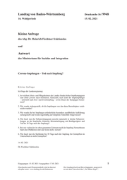 Landtag von Baden-Württemberg Drucksache 16 / 9948 16. Wahlperiode 15. 02. 2021 Kleine Anfrage des Abg. Dr. Heinrich Fiechtner fraktionslos und Antwort des Ministeriums für Soziales und Integration Corona-Impfungen – Tod nach Impfung? Kleine Anfrage Ich frage die Landesregierung: 1. In welchen Alters- und Pflegeheimen des Landes fanden bisher Impfkampagnen statt (bitte jeweils nach Institution, Gästezahl, nach Zahl der Impfempfänger – unterteilt nach Erst- und Zweitimpfung – sowie Dauer der Kampagne benen- nen)? 2. Wie wurde sichergestellt, ob die Impfungen von den dazu Berechtigten verab- reicht wurden? 3. Wie wurde die bei Impfungen erforderliche besonders ausführliche Aufklärung sichergestellt und wurde regelmäßig auf mögliche Todesfälle hingewiesen? 4. Wie hoch war die Nebenwirkungsrate jeweils (unterteilt in leichte Nebenwir- kungen an der Impfstelle, klinische Beeinträchtigung mit Bettlägerigkeit und Tod bis 30 Tage nach der Impfung)? 5. Bei wie vielen der im oben genannten Zeitraum nach der Impfung Verstorbenen fand eine Obduktion statt und wenn nicht, warum? 6. Wie hoch war die Sterberate bis 30 Tage nach der Impfung bei Geimpften im Unterschied zu nicht Geimpften? 14. 02. 2021 Dr. Fiechtner fraktionslos Eingegangen: 15. 02. 2021 / Ausgegeben: 17. 03. 2021 1 Drucksachen und Plenarprotokolle sind im Internet Der Landtag druckt auf Recyclingpapier, ausgezeich- abrufbar unter: www.landtag-bw.de/Dokumente net mit dem Umweltzeichen „Der Blaue Engel“.