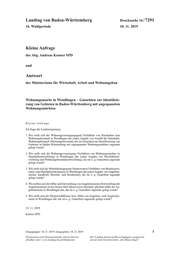 Landtag von Baden-Württemberg Drucksache 16 / 7291 16. Wahlperiode 18. 11. 2019 Kleine Anfrage des Abg. Andreas Kenner SPD und Antwort des Ministeriums für Wirtschaft, Arbeit und Wohnungsbau Wohnungsmarkt in Wendlingen – Gutachten zur Identifizie- rung von Gebieten in Baden-Württemberg mit angespannten Wohnungsmärkten Kleine Anfrage Ich frage die Landesregierung: 1. Wie stellt sich der Wohnungsversorgungsgrad (Verhältnis von Haushalten zum Wohnungsbestand) in Wendlingen dar (unter Angabe von Anzahl der Haushalte, Wohnungsbestand, Wohnungsleerstand), der im Gutachten zur Identifizierung von Gebieten in Baden-Württemberg mit angespannten Wohnungsmärkten zugrunde gelegt wurde? 2. Wie stellt sich die Wohnungsversorgung (Verhältnis von Wohnungsneubau zu Haushaltsentwicklung) in Wendlingen dar (unter Angabe von Haushaltsent- wicklung und Wohnungsbestandsentwicklung), die im o. g. Gutachten zugrunde gelegt wurde? 3. Wie stellt sich die Mietbelastungsquote (bruttowarm) (Verhältnis von Bruttowarm- miete zum Haushaltseinkommen) in Wendlingen dar (unter Angabe von Angebots- mieten, Kaufkraft, Betriebs- und Heizkosten), die im o. g. Gutachten zugrunde gelegt wurde? 4. Wie stellen sich die Höhe und Entwicklung von Angebotsmieten (Entwicklung der Angebotsmieten in den letzten fünf Jahren sowie alternativ absolute Höhe der An- gebotsmiete) in Wendlingen dar, die im o. g. Gutachten zugrunde gelegt wurde? 5. Wie stellt sich die Mietpreisdifferenz bzw. Höhe von Angebots- und Vergleichs- miete in Wendlingen dar, die im o. g. Gutachten zugrunde gelegt wurde? 18. 11. 2019 Kenner SPD Eingegangen: 18. 11. 2019 / Ausgegeben: 18. 12. 2019 1 Drucksachen und Plenarprotokolle sind im Internet Der Landtag druckt auf Recyclingpapier, ausgezeich- abrufbar unter: www.landtag-bw.de/Dokumente net mit dem Umweltzeichen „Der Blaue Engel“.