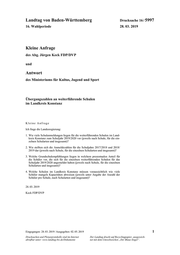 Landtag von Baden-Württemberg Drucksache 16 / 5997 Antwort Mit Schreiben vom 17. April 2019 Nr. 21-9532.23/64/1 beantwortet das Ministe- rium für Kultus, Jugend und Sport die Kleine Anfrage wie folgt: Ich frage die Landesregierung: 1. Wie viele Schulanmeldungen liegen für die weiterführenden Schulen im Land- kreis Konstanz zum Schuljahr 2019/2020 vor (jeweils nach Schule, für die ein- zelnen Schularten und insgesamt)? Die Schülerzahlen der Klassen 5 zum Stichtag der Prognose an öffentlichen Werk- real-/Hauptschulen, Realschulen, Gemeinschaftsschulen und Gymnasien für das Schuljahr 2019/2020 liegen nicht vor Mai 2019 belastbar vor. Die Zahlen werden nachgeliefert, sobald sie vorliegen. 2. Wie stellten sich die Anmeldezahlen für die Schuljahre 2017/2018 und 2018/ 2019 dar (jeweils nach Schule, für die einzelnen Schularten und insgesamt)? Die Schülerzahlen der Klassen 5 im Landkreis Konstanz zum Stichtag der Prog- nose an öffentlichen Werkreal-/Hauptschulen, Realschulen, Gemeinschaftsschu- len und Gymnasien für die Schuljahre 2017/2018 und 2018/2019 können der fol- genden Tabelle entnommen werden. Angaben auf Einzelschulebene werden nicht veröffentlicht. 6FKXODUW :HUNUHDO+DXSWVFKXOH 5HDOVFKXOH *HPHLQVFKDIWVVFKXOH *\PQDVLXP LQVJHVDPW 3. Welche Grundschulempfehlungen liegen in welchem prozentualen Anteil für die Schüler vor, die sich für die einzelnen weiterführenden Schulen für das Schuljahr 2019/2020 angemeldet haben (jeweils nach Schule, für die einzelnen Schularten und insgesamt)? Die Grundschulempfehlungen und Übergänge auf weiterführende Schulen wer- den im Rahmen der amtlichen Schulstatistik bei den abgebenden Grundschulen in Baden-Württemberg erfasst, nicht bei den aufnehmenden weiterführenden Schu- len. Angaben zu den Grundschulempfehlungen und Übergängen auf weiterfüh- rende Schulen werden nicht auf Einzelschulebene veröffentlicht. In der folgenden Tabelle sind die Grundschulempfehlungen der öffentlichen und privaten Grundschulen im Landkreis Konstanz zum Schuljahr 2018/2019 darge- stellt. Entsprechende Angaben zum Schuljahr 2019/2020 werden voraussichtlich im Januar 2020 vorliegen. 2