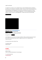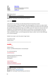 Von: An: Betreff: Datum: Anlagen: Melanie Wenzl Stefanie Lefeldt WG: Rückfrage Pressemitteilung Julia Klöckner Montag, 8. Juli 2019 09:48:43 image001.png Von: Melanie Wenzl Gesendet: Mittwoch, 3. Juli 2019 09:55 An: ' Betreff: AW: Rückfrage Pressemitteilung Julia Klöckner Lieber Herr vielen Dank für Ihre Anfrage. Die mabb überprüft bei hier lizenzierten privaten Rundfunkveranstaltern und bei denjenigen Telemedienangeboten, für die wir als mabb in Berlin und Brandenburg zuständig sind, u.a. die Trennung von Werbung und Inhalt sowie die Einhaltung des Jugendmedienschutzstaatsvertrags. Da das BMEL seinen Sitz in Berlin hat, hat die mabb nach Eingang von rund 20 Beschwerden das Video von Julia Klöckner und Nestlé geprüft. Bei einer solchen Prüfung nehmen wir im ersten Schritt Kontakt mit den Verantwortlichen auf, die das Video veröffentlicht haben, um die Hintergründe des Videos zu klären. Auch mit dem BMEL gab es ein solches Gespräch. Melden Sie sich gern, wenn Sie weitere Fragen haben. Freundliche Grüße Melanie Wenzl ______________________________________________ Melanie Wenzl Presse- und Öffentlichkeitsarbeit, Veranstaltungen Tel: +49 30 264 967 81 wenzl@mabb.de Medienanstalt Berlin-Brandenburg Kleine Präsidentenstr. 1 10178 Berlin www.mabb.de twitter.com/mabb_de facebook.com/Medienanstalt.BB Von: Gesendet: Dienstag, 2. Juli 2019 15:13 An: Melanie Wenzl <Wenzl@mabb.de> Betreff: AW: Rückfrage Pressemitteilung Julia Klöckner 124
