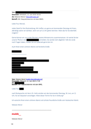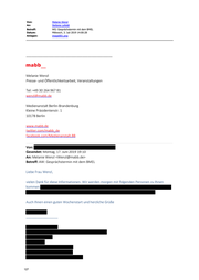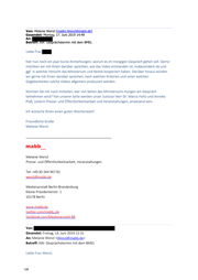 Liebe Frau Wenzel, ich wollte mir von Ihnen nur kurz erklären lassen, wieso die Medienanstalt zuständig ist, das Video von Frau Klöckner und Nestlé zu prüfen. Und was mit der Formulierung aus Ihrer Pressemitteilung „Aufsichtsgespräch mit Vertretern des Ministeriums“ gemeint ist. Hat die mabb das Ministerium zu einem Gespräch aufgefordert, um sich die Hintergründe des Videos erklären zu lassen? Ist das ein „Aufsichtsgespräch“? Danke schon einmal und viele Grüße, Von: Melanie Wenzl [mailto:Wenzl@mabb.de] Gesendet: Dienstag, 2. Juli 2019 15:09 Betreff: Rückfrage Pressemitteilung Julia Klöckner Sehr geehrter Herr mein Kollege hat mich auf Ihren Anruf bzgl. des Klöckner-Videos aufmerksam gemacht. Aktuell bin ich noch in einer Besprechung. Wäre es möglich, dass Sie mir ihre Fragen per Mail zukommen lassen? Ich wünsche Ihnen einen schönen Tag. Freundliche Grüße Melanie Wenzl ______________________________________________ Melanie Wenzl Presse- und Öffentlichkeitsarbeit, Veranstaltungen Tel: +49 30 264 967 81 wenzl@mabb.de 125