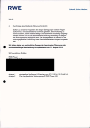 RW E Seite 46 4. Kurzfristige abschließende Klärung erforderlich Sollten zu einzelnen Aspekten der obigen Darlegungen weitere Fragen aufkommen, wird abschließend nochmals gebeten, diese frühzeitig zu kommunizieren, damit weitere Belege und Nachweisekurzfristig vorgelegt werden könnenund so die abschließende Klärung rechtzeitig vor Beginn der Rodungssaison ermöglicht wird. Die Antragstellerin ist hierauf für die ordnungsgemäßeFortführung ihres Geschäftsbetriebes dringend angewie- sen. Wir bitten daher um verbindliche Zusage der beantragten Räumung oder rechtsmittelfähige Bescheidung bis spätestens zum 31. August 2018. Mit freundlichen Grüßen RWE Power Anlage 1 Anlage 2 einstweilige Verfügung LG Aachen vom 27.11.2014 (12 O 448/14) Plan bergbaulicher Nutzungszugriff RWE Power AG Zukunft. Sicher. Machen.