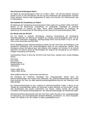 Kreis Kleve Der Landrat Fachbereich Gesundheit Veterinärangelegenheiten und Lebensmittelüberwachung Nassauerallee 15 – 23 47533 Kleve Anfrage nach dem Verbraucherinformationsgesetz Kontrollergebnisse Lebensmittelbetriebes im Kreis Kleve betreffend / Anfrage Nr. eines Erklärung: Ich habe die nachstehenden Erläuterungen zum Datenschutz gelesen und willige in die Speicherung meiner personenbezogenen Daten im Sinne der DS-GVO und des DSG NRW, zum Zwecke der Bearbeitung meiner VIG-Anfrage betreffend die Lebensmittelüberwachung, ein. Meine Postanschrift lautet: __________________________________________________________________________ Name, Vorname, Straße Hausnummer, PLZ Ort ____________________________________________ Ort, Datum, Unterschrift Erläuterungen zum Datenschutz im Sinne der DS-GVO des DSG NRW und des VIG Der Kreis Kleve verarbeitet Ihre personenbezogenen Daten, wenn Sie das beiliegende Formular ausfüllen oder Ihre Daten bereits vorab mitgeteilt haben. Dabei werden Ihre Daten gemäß den gesetzlichen Vorgaben, insbesondere denen der seit dem 25.05.2018 unmittelbar geltenden EU- Datenschutz-Grundverordnung (DS-GVO) in Verbindung mit dem Datenschutzgesetz NRW (DSG NRW) verarbeitet. Sie haben mich gebeten, Ihnen im Rahmen des Verbraucherinformationsgesetzes Informationen zu einem Lebensmittelbetrieb in meinem Überwachungsbereich zu erteilen. Hierzu benötigt der Fachbereich Gesundheit, Abteilung Veterinärangelegenheiten und Lebensmittelüberwachung, Nassauerallee 16, 47533 Kleve, Ihre personenbezogenen Daten. Ihre in diesem Zusammenhang zu verarbeitenden personenbezogenen Daten sind zweckgebunden, das heißt, sie werden nur für den Zweck verwendet, für den Sie erhoben worden sind. Sofern Sie Ihre personenbezogenen Daten nicht bereitstellen möchten, hätte dies zur Folge, dass die vorgenannte Dienstleistung nicht beansprucht bzw. erbracht werden könnte. Im Falle eines Antrages des Betreibers / der Betreiberin des angefragten Betriebes auf Offenlegung Ihrer persönlichen Daten werde ich Ihren Namen und Ihre Anschrift nach § 5 Abs. 2 Satz 3 VIG herausgeben. Die im Rahmen der o.a. Dienstleistung erfassten personenbezogenen Daten werden für die Dauer von 10 Jahren gespeichert.