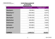 Bayerisches Staatsministerium für Wissenschaft, Forschung und Kunst Anteile Regierungsbezirke am Vorschlag Kulturfonds 2009 prozentualer Anteil am Gesamtzuwendung 2009 Gesamtvolumen Oberbayern 986.480 € 16,58% Niederbayern 1.137.200 € 19,11% Oberpfalz 943.500 € 15,85% Oberfranken 876.000 € 14,72% Mittelfranken 319.900 € 5,38% Unterfranken 585.900 € 9,85% Schwaben 858.541 € 14,43% überregional 243.660 € 4,09% SUMMEN: 5.951.181 € 100,00% -7- Stand: 12.03.2010