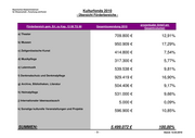 Bayerisches Staatsministerium für Wissenschaft , Forschung und Kunst Kulturfonds 2010 - Übersicht Förderbereiche - prozentualer Anteil am Förderbereich gem. Erl. zu Kap. 13 08 TG 90 Gesamtzuwendung 2010 Gesamtvolumen a) Theater 709.800 € 12,91% b) Museen 950.909 € 17,29% c) Zeitgenössische Kunst 414.800 € 7,54% d) Musikpflege 317.300 € 5,77% e) Laienmusik 539.538 € 9,81% f) Denkmalschutz und Denkmalpflege 929.419 € 16,90% g) Archive, Bibliotheken, Literatur 504.406 € 9,17% h) Heimatpflege 531.000 € 9,66% j) Internationaler Ideenaustausch 5.000 € 0,09% k) Sonstige kulturelle Veranstaltungen und Projekte 596.900 € 10,85% SUMMEN: 5.499.072 € 100,00% -9- Stand: 12.03.2010
