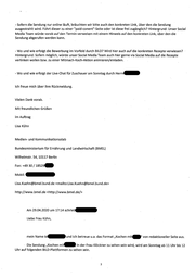 - Sofern die Sendung nur online läuft, bräuchten wir bitte auch den konkreten Link, über den die Sendung ‚ausgestrählt wird. Führt dieser zu einer "paid-conent"-Seite oder ist diese frei zugänglich? Hintergrund: Unser Social Media Team würde vorab auf den Termin verweisen mit einem Hinweis auf den konkreten Link, über den die Sendung abgerufen werden kann. - Wo und wie erfolgt die Bewerbung im Vorfeld durch BILD? Wird hier auch auf die konkreten Rezepte verwiesen? Hintergrund: Sofern möglich, würde unser Social Media Team auch hier gerne via Social Media auf die Rezepte . verlinken wollen bzw. zu einer Mitmach-Koch-Aktion animieren/einladen. -Wo und wie erfolgt der Live-Chat für Zuschauer am Sonntag durch HerrriD Ich freue mich über Ihre Rückmeldung. Vielen Dank vorab. Mit freundlichen Grüßen im Auftrag Lisa Kühn Medien- und Kommunikationsstab Bundesministerium für Ernährung und Landwirtschaft (BMEL) Wilhelmstr. 54, 10117 Berlin Fon: +49 30 / 18529 Mobil: ED Lisa.Kuehn@bmel.bund.de <mailtö:Lisa.Kuehn@bmel.bund.de> http://www.bmel.de <http://www.bmel.de/> Am 29.04.2020 um 17:14 schrie ED Liebe Frau Kühn, mein Name sD und ich betreue u.a. das Format „Kochen mit von redaktioneller Seite aus. : Die Sendung „Kochen mi in der Frau Klöckner zu sehen sein wird, wird am Sonntag ab 11 Uhr bis 12 Uhr auf folgenden BILD-Plattformen zu sehen sein.