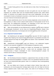 Redaktionelle Arbeit A-600/5 3.1.11 Teilen/Liken von Inhalten Dritter 328. Bei direkten oder indirekten Verweisen (Teilen/Liken) durch Links auf fremde Internetseiten, die außerhalb des Verantwortungsbereiches der Bundeswehr liegen, ist das Urheberrecht zu beachten. Das Teilen oder Liken von Inhalten, die durch Firmen oder Privatpersonen erstellt worden sind, ist daher zu unterlassen. 329. Teilt man einen Beitrag von einer Internetseite oder einem Auftritt in den Sozialen Medien außerhalb der Bundeswehr, zum Beispiel bei Facebook, wird dieser mit Bild und einem Textauszug in der Vorschau angezeigt. Solange keine explizite Einwilligung des Urhebers vorliegt, handelt es sich hierbei um eine Verletzung der Verwertungsrechte. Das Risiko, eine Abmahnung zu erhalten, kann deutlich reduziert werden, indem man nur Beiträge teilt, die selbst mit Empfehlungsschaltflächen wie st ! „Gefällt mir“ zum Teilen auffordern. Jedoch muss der Betreiber bzw. die Betreiberin, auf den bzw. die sd i en verlinkt werden soll, auch selbst das Recht haben, die Erlaubnis zu erteilen. Fehlt in der ng Originalquelle auch die namentliche Nennung des Urhebers bzw. der Urheberin, liegt eine weitere de Än Postings bergen auch die Gefahr von Wettbewerbsverstößen. Beim Teilen oder Liken von m 330. ru Urheberrechtsverletzung vor. de Inhalten, die durch Firmen (z. B. der Rüstungsindustrie) erstellt worden sind, gilt der Grundsatz der Gelegentliches Teilen/Liken ausgewählter positiver Inhalte Dritter (z. B. Online-Artikel einer eg 331. tn ic ht Gleichbehandlung sowie die Vermeidung von irreführenden und vergleichenden Behauptungen. te rli Zeitung über die Bundeswehr) erhöht die Authentizität des eigenen Kanals und wirkt sich zudem auf un die Reichweite und Vernetzung aus. Unter Beachtung des Urheberrechts kann der Bundeswehrauftritt dr uc k mit maximal zehn Prozent solcher Inhalte ergänzt werden. Das Kerngeschäft ist der selbst rA us produzierte Beitrag. Formale Vorgaben 3.2.1 Facebook D ie se 3.2 Für die Erstellung eines Postings gelten einheitlich folgende Vorgaben für alle Auftritte der Bundeswehr: 332. Das Posting beginnt direkt mit dem Text. Überschriften sind nicht zu verwenden. Der erste Satz sollte kurz und präzise auf das Thema hinweisen. Dies kann z. B. in Form einer Zusammenfassung, einer Frage oder eines Hashtags umgesetzt werden. 333. Der Text sollte ohne Versalien oder andere Hervorhebungen auskommen und für sich stehen. Ausrufezeichen, mehrere Fragezeichen in Folge oder Vergleichbares sollten, auch wenn es in den Sozialen Medien weit verbreitet ist, unterbleiben. Seite 17 Stand: Januar 2017