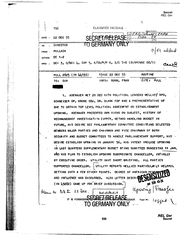 Secret REL Ger .t. OATE CLASSIFIED l':lE::;S,:\~iE :. 156 22'DEC SEbliafREieJ\;kfW~~~-- 19 55 6======--=::;iiq11 a~-G~t:~RM~A~~f\J Y~ow-· DIRECTOR TO FROM : PULLACH ACTION: EE 1-2 INFO DCI 3, - {A l' 4, D/OCI COP 5, A/DD/P/P 6, 7-8 S/C -- cuQ~ {SUSPENSE DD/I) F=============================-==================--=-==·==========-==- PULL 2825. (IN 44193) - TO: 55 151oz 22 DEC ROUTINE f'llf.Cl!DEMCr. INFO: DIR 10 BONN, FRAN CITE: PULL ADENAUER fl£T 20 DEC \'!I TH POL IT I CAL LEA DER S MELLI E~ SPO, 1 SCHNEIDER OP, KR9NE COU, DR. BLANK FOP ANO A PREPRESENTATlVE OF. ,·, I BHE TO OATAIN TOP LEVF.L'POLITtCAL AGAEEMFNT ON ESTABLISHMENT UPSWING. ADENAUER PRESENTED OWN VIEWS ON SUBJECT, HISTORY OF ;;_<' ,,·. RECHMJNGSHOF INVEST! GATI c)N Z IPPE'R, METHOD HANDLING BUDGET IN FUTURE~. HIS DES IRE SEE P/\RLIAMF.NTARY COMMITTF.E CONS I ST.ING SELECTED MEueERS MAJOR ·. PARTl~S AND CHAIRMAN ANO VICE CHAIRMAN OF BOTH SECURITY AND BUDGET COMMITTEES TO HANDLE PARLIAMENTARY SUPPO~T, HIS 56, DES rnE ESTABLISH UPSW l'\\IG lN JANUl\.I:\\ \ IN LAST QUARTERS SUPPLEMENTARY BUDGET .. HIS INTENT IWCUJDE UPSW l'°'G. B~ING SUMITTEO BUNDESTAG 11 JAN. A~O HIS PLAN TO £STABLISH UPSW_ING SUBORDl.NATE CHANCELLOR, INTIALLY BY EXECUTIVE ORDER. UTILITY GAVE SHORT BRIEFING. 'SUPPOR:r~o ·CHANCELLOR. F (IN 4~282) WAS ALL PARTIES· HE~PFUL AMER l~~'t_\\lf\lf\ltb 1LI TY REPORTS •RELLtEs PARTICULM LY GETTUJG OVF.R A F!W STICKY POINTS. AND INF'UJENCE • DISCUSSED. Of:G~EE .OF l\LSO LE·TT.fR DESCA CAME UP FOR::·BR IEF DISCUSS . . ION~ . 1,-~&,\ • tU ~un ~ t.\1 l\·'1\ . Ir-fa.t+~ ~ ~ ~~~IS ~:~~•mBE~SA; <•ov: 0-~ -TO GERMANY--ONLY I ~--- 559 \ · -- REL Ger Secret