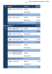 Anlage zur Schriftlichen Anfrage Drucksache 17/22694 - 199 - Epl. Kapitel Stellen für 2018 1270 Landesamt für Wasserwirtschaft Beamte Arbeitnehmer Zwischensumme Kap. 1270 1277 Wasserwirtschaftsämter Beamte 877,65 Arbeitnehmer 1.691,50 Zwischensumme Kap. 1277 2.569,15 Summe Epl. 12 6.144,67 Allgemeine Bewilligungen für den 13 1303 Gesamthaushalt Beamte 811,00 Zwischensumme Kap. 1303 811,00 1304 Allgemeines Grundvermögen Arbeitnehmer Zwischensumme Kap. 1304 1305 Wirtschaftliche Unternehmen Beamte 278,75 Zwischensumme Kap. 1305 278,75 1312 Offensive Zukunft Bayern III Beamte Arbeitnehmer Zwischensumme Kap. 1312 Verwendung der Erlöse aus der 1314 Veräußerung von e.on-Anteilen Beamte ("Offensive Zukunft Bayern IV") Arbeitnehmer Zwischensumme Kap. 1314 1330 Zukunft Bayern 2020 Beamte 21,50 Arbeitnehmer Zwischensumme Kap. 1330 21,50