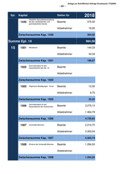 Anlage zur Schriftlichen Anfrage Drucksache 17/22694 - 201 - Epl. Kapitel Stellen für 2018 Staatliche Gesundheitsverwaltung 1440 bei den Landratsämtern und Beamte 375,50 gerichtsärztliche Dienste Arbeitnehmer 19,00 Zwischensumme Kap. 1440 394,50 Summe Epl. 14 984,08 15 1501 Ministerium Beamte 144,33 Arbeitnehmer 44,34 Zwischensumme Kap. 1501 188,67 Sammelansätze für den 1502 Gesamtbereich des Epl. 15 Beamte Arbeitnehmer Zwischensumme Kap. 1502 1505 Allgemeine Bewilligungen - Kunst Beamte 12,50 Arbeitnehmer 9,75 Zwischensumme Kap. 1505 22,25 Sammelansätze für den 1506 Gesamtbereich der Hochschulen Beamte 3.275,13 Arbeitnehmer 1.464,79 Zwischensumme Kap. 1506 4.739,92 1507 Universität München Beamte 2.210,75 Arbeitnehmer 3.353,04 Zwischensumme Kap. 1507 5.563,79 1508 Klinikum der Universität München Beamte 1.294,50 Arbeitnehmer Zwischensumme Kap. 1508 1.294,50